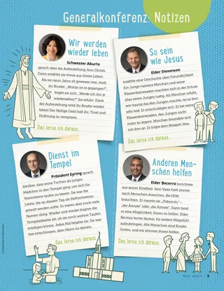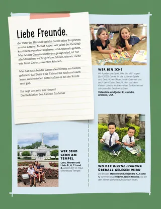 Mai 2021 Liebe Freunde Russell M. NelsonGlaube versetzt BergeEine besondere Konferenzansprache von Präsident Russell M. Nelson zum Thema Glaube Generalkonferenz: NeuigkeitenWichtige Neuigkeiten von der Generalkonferenz Generalkonferenz: NotizenLies ein paar Geschichten von der Generalkonferenz und notiere, was du daraus lernst. Erzähl uns was – von der KonferenzAussagen und Kunstwerke von Kindern aus aller Welt – diesmal zur Generalkonferenz Amber HealeyAusgesperrt! Spaß mit den Schriften Maryssa DennisEine bleibende Erinnerung Elder Cook besucht die Philippinen Wir danken, o Gott, für den Propheten Sophie aus Norwegen Jesus Christus hat geholfen, die Erde zu erschaffen Abenteuer in Norwegen mit Margo und Paolo Richard M. RomneyFußball oder Sabbat? Karten zur Geschichte der Kirche Suchbild Aufmunternde Worte an dich selbst Haley YanceyEine Statue von Jesus Boston B.Unser Umzug Welche Gaben hast du? Lukas und Lene Für ältere Kinder Lucy Stevenson Ewell und Nancy HarwardSam Beazley Alice A.Mein erstes Fasten Erinnerungen schaffen Charlotte LarcabalCharlottes Familie Zeichne Joseph Smith Für unsere Kleinen Taaras neuer Freund Ein neues Zuhause für die Heiligen Ich kann auch etwas schaffen, was schwer ist! Jane McBrideEine Geburtstagskrone Christine GrahamZeit zur Andacht Spaß mit den Schriften für die ganz Kleinen Liebe Eltern