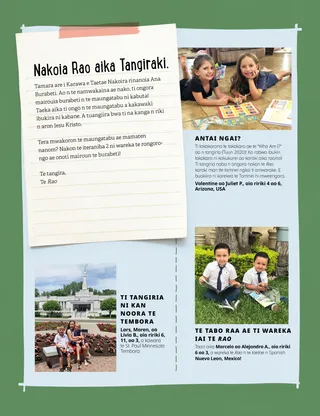 Meei/Tuun 2021 Nakoia Rao aika Tangiraki Russell M. NelsonA Na Mwaing Maunga Man te Onimaki IrounaWareka ana rongorongo Beretitenti Russell M. Nelson ae onoti iaon te onimaki. Amber HealeyE Rokanaki! Linda DaviesKaitibo ma Shiloh mai Biribin E Kairiia Tabeman Iesu Te Neweaba i Biribin ma Margo ao Paolo Haley YanceyBouan Iesu ae Kaaraki Ukoria! Ti karabwako te Atua, Ibukin am Burabeti Raihau T.I Katanga te Anene Tera Am Bwaintangira? Bwaai aika Ko na Ururing Kaotia ao Taekinna Richard M. RomneyTe Butiboro ao te Tabati Unimwaane Cook E Kawara Biribin Korea tamnein Iotebwa Timiti Lucy Stevenson EwellJulia Mavimbela Aika Itiaki A Katea te Mweenga ae Boou I Kona ni Karaoi Bwaai Aika a Kangaanga Haley YanceyBraden e Kaira te Kawai Isabella S.N na Manga Noora Riki Tariu Kaati n Rongorongon te Ekaretia Nakoia Kaaro aika Tangiraki