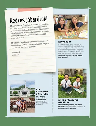 2021. május Kedves jóbarátok! Russell M. NelsonA hit hegyeket fog megmozgatniOlvass el egy különleges konferenciai üzenetet a hitről Russell M. Nelson elnöktől. Konferenciai hírekTudj meg fontos híreket az általános konferenciáról! Konferenciai jegyzetOlvass el néhány történetet az általános konferenciáról, és írd le, mit tanultatál! Mutasd és mesélj! – Konferenciai kiadásGyermekektől származó, az általános konferenciáról szóló idézetek és műalkotások gyűjteménye szerte a világból. Amber HealeyKizárva Játékosan a szentírásokról Maryssa DennisTekerő testvérek Cook elder a Fülöp-szigetekre látogat Prófétánkat köszönjük, Atyánk Ő Sophie, Norvégiából Jézus segített megteremteni a Földet Kalandozás Norvégiában Margóval és Paolóval Richard M. RomneyFoci és a sabbat Egyháztörténeti kártyák Találd meg! Biztató szavak Haley YanceyA Jézus-szobor Boston B.A családunk költözése Neked milyen ajándékaid vannak? Máté és Metti Nagyobb gyermekeknek Lucy Stevenson Ewell és Nancy HarwardSam Beazley Alice A.Az első böjtöm Szerezz emlékeket Charlotte LarcabalSára családja Rajzold le Joseph Smitht Kis barátoknak Tara új barátja A szentek új otthont építenek Képes vagyok nehéz dolgokat megtenni Jane McBrideA szülinapi korona Christine GrahamIdeje áhítatosnak lenni Játékosan a szentírásokról kicsiknek Kedves Szülők!