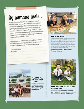 Mey/Jona 2021 Ry namana malala Russell M. NelsonHamindra tendrombohitra ny finoanaHamaky hafatra miavaky ny fihaonambe momba ny finoana avy amin’ny Filoha Russell M. Nelson. Amber HealeyVoahidy tany ivelany! Linda DaviesAndao hifankahafantatra amin’i Shiloh avy any Filipina Tsy nanilika ny hafa i Jesoa Dia nampientanentana tany Filipina niarahana tamin’i Margo sy i Paolo Haley YanceySarivongan’i Jesoa Tadiavo! Misaotra Anao noho ny Mpaminany Raihau T.Nitendry hira tao amin’ny fihirana aho Inona avy ireo fanomezam-pahasoavana anananao? Zavatra tokony hotadidiana Asehoy sy lazao Richard M. RomneyBaolina kitra sy ny Sabata Mitsidika ao Filipina ny Loholona Cook Manaova sarin’i Joseph Smith Lucy Stevenson EwellJulia Mavimbela Manorina fonenana vaovao ny Olomasina Afaka manao zavatra sarotra aho Haley YanceyTarihin’i Braden ny lalana Isabella S.Mbola hahita ny anadahiko indray aho Karatra misy ny tantaran’ny Fiangonana Ry ray aman-dreny malala