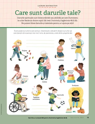 mai/iunie 2021 Dragi prieteni Russell M. NelsonCredința va muta munțiiCitiți un mesaj special despre credință al președintelui Russell M. Nelson, din cadrul conferinței. Amber HealeyRămasă încuiată pe dinafară! Linda DaviesFă cunoștință cu Shiloh din Filipine Isus i-a inclus pe alții Aventuri în Filipine cu Margo și Paolo Haley YanceyO statuie a lui Isus Găsește-le! Mulțumim, Ție, Dumnezeul nostru Raihau T.Eu am cântat un imn Care sunt darurile tale? Lucruri pe care să ți le aduci aminte Arată și povestește Richard M. RomneyFotbalul și ziua de sabat Vârstnicul Cook vizitează Filipine Desenează-l pe Joseph Smith Lucy Stevenson EwellJulia Mavimbela Sfinții clădesc o așezare nouă Pot face lucruri grele Haley YanceyBraden arată calea Isabella S.Eu îmi voi vedea fratele din nou Cartonașe cu istoria Bisericii Dragi părinți