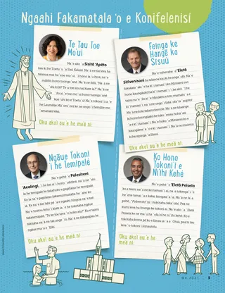 Mē 2021 Si‘i Kaungāmeʻa Russell M. NelsonʻE Hiki ʻe he Tuí ʻa e ʻOtu MoʻungáLau ha pōpoaki makehe meia Palesiteni Lāsolo M. Nalesoni fekauʻaki mo e tuí, mei he konifelenisí. Ongoongo ‘o e konifelenisíAko ha ngaahi ongoongo mahuʻinga mei he konifelenisi lahí! Ngaahi Fakamatala ʻo e KonifelenisíLau ha ngaahi talanoa mei he konifelenisi lahí pea hiki e meʻa naʻá ke akó. Fakahā pea Tala ʻo e KonifelenisíKo ha ngaahi kupuʻi lea mo e tā valivali mei he fānau ʻi he funga ʻo e māmaní—fekauʻaki kotoa mo e konifelenisi lahí! ʻEmipā HīlīLokaʻi ʻi Tuʻa! Taimi Fiefia ʻi he Folofolá Fai ʻe Maryssa DennisOngo Tautehina Heka Pasikalá ʻAʻahi ʻa ʻEletā Kuki ki Filipainí Fakamālō ki he ʻOtuá Koeʻuhí ko ha Palōfita Fe‘iloaki mo Sofi mei Noauē Naʻe Tokoni ʻa Sīsū ke Fakatupu ʻa e Māmaní ʻEveʻeva ʻi Noauē mo Māko mo Paoló Richard M. RomneySoká mo e Sāpaté ʻŪ Kaati Hisitōlia ʻo e Siasí Kumi Ia! Ngaahi Lea Fkalotolahi Haley YanceyKo ha Tā Tongitongi ʻo Sīsū Boston B.Ko e Hiki Homau Fāmilí Ko e Hā Hoʻo Ngaahi Meʻafoakí? Meti mo Menitī Ma‘á e Fānau Lalahi Angé Lusi Sitīvenisoni ʻIuela mo Nenisī Hāuati.Semi Peasilī ʻĀlisi A.Ko ʻEku Fuofua ʻAukaí Ko Hono Fakahoko ha Ngaahi Manatu Melie Sālote LakeipoloKo e Fāmili ʻo Sāloté Tā e fakatātā ʻo Siosefa Sāmitá Maʻá e Ngaahi Kaumeʻa Īkí Kaumeʻa Foʻou ʻo Talá Ko Hono Langa ʻe he Kāingalotú ha ʻApi Foʻou ʻOku Ou Lava ʻo Fakahoko Ha Ngaahi Meʻa Faingataʻa Jane McBrideKo ha Kalauni Faiʻaho Christine GrahamKo ha Taimi Ke ʻApasia. Taimi Fiefia ʻi he Folofolá maʻá e Fānau Īkí Siʻi Ngaahi Mātuʻa