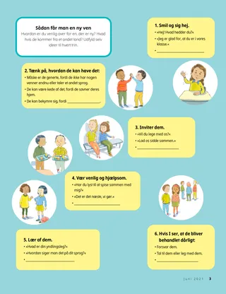 Hvordan er du venlig over for en, der er ny? Hvad hvis de kommer fra et andet land? Udfyld selv ideer til hvert trin.