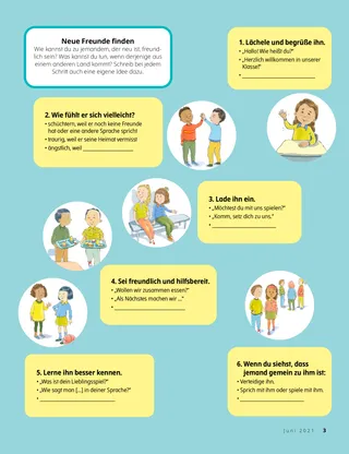 Wie kannst du zu jemandem, der neu ist, freundlich sein? Was kannst du tun, wenn derjenige aus einem anderen Land kommt? Schreib bei jedem Schritt auch eine eigene Idee dazu.