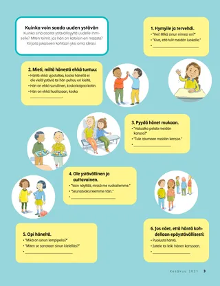 Kuinka sinä osoitat ystävällisyyttä uudelle ihmiselle? Miten toimit, jos hän on kotoisin eri maasta? Kirjoita jokaiseen kohtaan yksi oma ideasi.