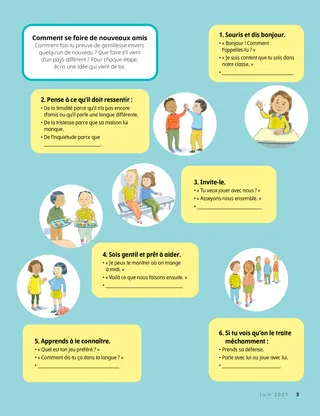 Comment fais-tu preuve de gentillesse envers quelqu’un de nouveau ? Que faire s’il vient d’un pays différent ? Pour chaque étape, écris une idée qui vient de toi.