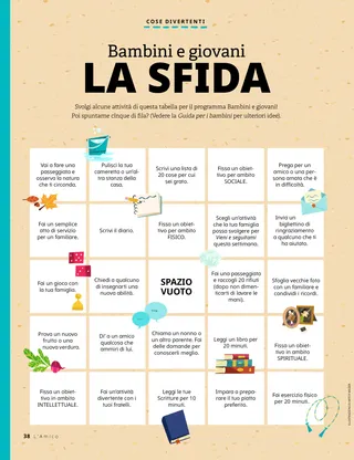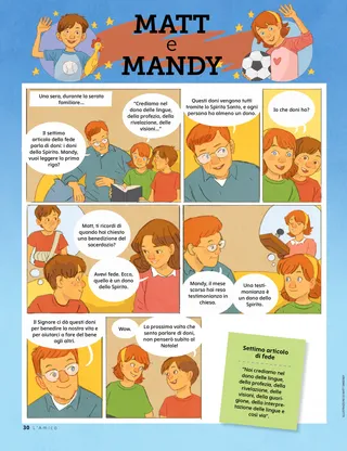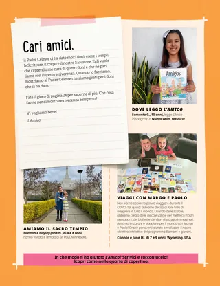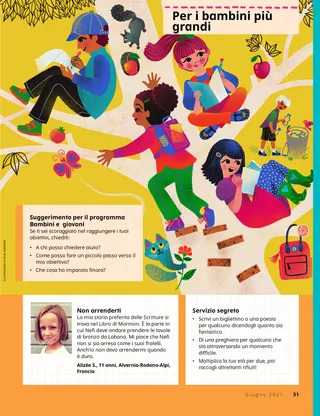 Giugno 2021 Cari amici,Questa pagina include una lettera dal personale e i contributi dei bambini su come leggono L’Amico. Dallin H. OaksEssere gentiliIl presidente Oaks racconta la storia di un bambino profugo che viene preso in giro per essere diverso. Incoraggia i bambini a essere gentili. Adattato da un discorso tenuto alla conferenza generale. Haley YanceyTè o succo di mango?Chung prende la decisione di bere il succo, perché il tè è contro la Parola di saggezza. Il suo amico, Jiro, lo aiuta a difendere le sue convinzioni quando diventa difficile, anche se Jiro non è un membro della Chiesa. È ora di divertirsi con le ScrittureLezioni per la serata familiare basate sui compiti di lettura settimanali di Vieni e seguitami. Per Dottrina e Alleanze 60–75. Glenda Méndez de LópezUna preghiera per papiIl padre di Danna non stava avendo una buona giornata, così Danna decise di pregare per lui e scrivergli una lettera speciale in cui gli diceva quanto significasse per lei. L’anziano Christofferson visita il VietnamScopri di più sulla visita dell’anziano D. Todd Christofferson in Vietnam. Abbina i templiTraccia le linee per abbinare il tempio a luogo in cui si trova. Incontriamo Karles da PortoricoKarles ama aiutare le persone. Ha aiutato dopo un potente terremoto nel gennaio 2020 e ha servito la comunità nel corso dell’anno. Per saperne di più su Karles, leggi l’articolo. Gesù serviva gli altriGesù insegnò che è importante servire gli altri. Se aiutiamo gli altri, saremo felici. Questa pagina include un’attività per aiutare i bambini a pianificare un modo di servire e la storia di una bambina sul servire gli altri. Avventure a Portorico con Margo e PaoloMargo e Paolo visitano Portorico per insegnare ai bambini come sono le altre culture. Inoltre invitano i bambini a servire nelle loro comunità. Charlotte LarcabalProprio come aveva immaginatoKvitka stava per essere battezzata! Ma, a causa della pandemia di COVID-19, solo poche persone potevano venire a vedere il suo battesimo. Tuttavia, sua nonna la aiutò a sentirsi meglio. Schede sulla storia della ChiesaScopri di più su Marie Cardon, una convertita italiana di grande fede, e Anthon Lund, un convertito danese che crescendo divenne presidente di missione e apostolo. Trova gli oggetti!Trova gli oggetti nascosti nell’immagine. Lori Fuller SosaProvare insiemeJack era nei guai. Sua madre lo aveva sgridato e lui le aveva risposto gridando, e questo rattristava Jack. Desiderava che sua madre non lo avesse sgridato e che lui non le avesse risposto gridando. Lui e sua madre decisero di riprovarci. Un’idea brillanteIl messaggio di questo mese è: “Il Signore sa chi sono e mi ama”. Océane P.Mio fratello mi ha battezzatoUn racconto scritto da una bambina sulla sua esperienza battesimale. Tutta la sua famiglia è stata coinvolta nella sua esperienza, proprio come voleva lei. Rispetto per le cose sacreIl Padre Celeste desidera che mostriamo rispetto per le cose speciali e importanti che ci ha dato. Questa pagina dimostra come essere rispettosi e riverenti, e fornisce anche un’attività per aiutare a insegnare ai bambini come essere rispettosi verso le cose sacre. Sharon EubankUna pesca alla voltasorella Sharon Eubank, prima consigliera della presidenza generale della Società di Soccorso, parla dei suoi pensieri e sentimenti in merito all’invito di Helping Hands. Condivide anche una storia su ciò che ha imparato mentre raccoglieva le pesche con la sua famiglia da bambina. Cuori origamiImpara a fare un cuore origami, poi scrivici sopra una nota gentile e dallo a qualcun altro! Mostra e raccontaMateriale inviato da bambini di tutto il mondo che parlano di esperienze personali con argomenti che vanno dal servizio allo studio delle Scritture. Matt e MandyFumetto: Matt e Mandy imparano di più sui doni spirituali durante una lezione della serata familiare sul settimo articolo di fede. Per i bambini più grandiSuggerimenti per quando i bambini sono scoraggiati, il contributo di una bambina sulla sua storia preferita delle Scritture e un’idea per un progetto di servizio segreto. Lucy Stevenson EwellAna Cumandá Rivera Taylor B.Infornare pane per la mia missioneUn contributo di un bambino che racconta la storia su come ha preparato e venduto pane per raccogliere i fondi per la sua missione. È stato un lavoro duro, ma ha finito con l’apprezzarlo! Non arrenderti!Una pagina dedicata ad aiutare i bambini a sviluppare capacità di pensiero critico mentre imparano che cosa significa avere determinazione e resilienza. Amber HealeyLa nuova casa di OmbeniOmbeni cerca di ambientarsi nella sua nuova scuola negli Stati Uniti dopo essersi trasferito dalla Repubblica Democratica del Congo, ma non conosce l’inglese e ha paura. Impara che servire può aiutarlo a sentirsi meglio. Sfida per Bambini e giovaniUn’attività che i bambini possono fare per essere incoraggiati a soddisfare i requisiti del programma Bambini e giovani. Per i piccoli amici Riverente in PrimariaUn racconto illustrato, scritto appositamente per i bambini piccoli. Sione dimostra come può essere riverente in Primaria. Le sorelle Rollins salvano la situazione!Un racconto illustrato, scritto appositamente per i bambini piccoli. Questo è un racconto tratto dalla storia della Chiesa su Mary Elizabeth e Caroline Rollins, che salvarono le prime copie di Dottrina e Alleanze quando una folla inferocita attaccò la loro città. Posso essere coraggiosoIl messaggio di questo mese è: “Posso essere coraggioso”. Lori RiesUn giorno in spiaggiaUn racconto illustrato senza dialoghi, creato appositamente per i bambini piccoli. Una famiglia va in spiaggia e guarda tutte le cose che il Padre Celeste ha creato. Ciao, amici!Contributi dei bambini più piccoli su ciò che stanno facendo per avvicinarsi a Gesù Cristo. È ora di divertirsi con le Scritture per i più piccoliLezioni semplificate per la serata familiare basate sui compiti di lettura settimanali di Vieni e seg