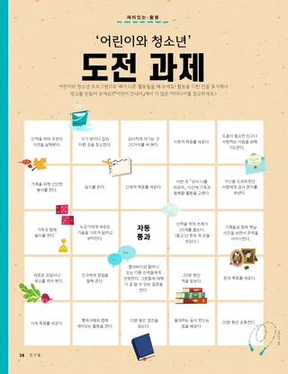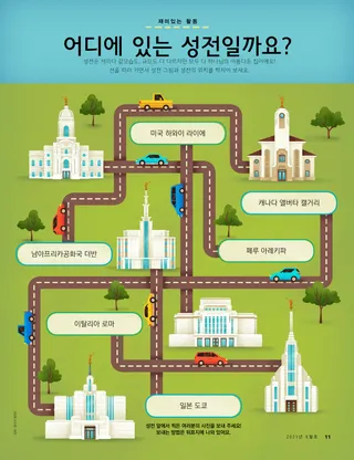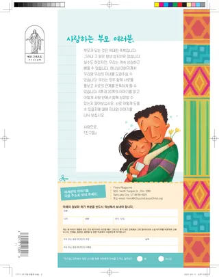 2021년 6월호 사랑하는 친구들에게여기에는 편집팀의 편지와, 어린이들이 『친구들』을 읽는 방법에 대해 이야기한 내용이 나와 있습니다. 댈린 에이치 옥스 회장친절하십시오옥스 회장이 다르다는 이유로 놀림거리가 된 난민 소년에 대한 이야기를 들려주며, 어린이들에게 서로 친절하게 대하도록 격려합니다. 연차 대회 말씀에서 가져옴. 헤일리 얜시버블티와 망고 주스충은 차가 지혜의 말씀에 어긋난다는 것을 알았기 때문에 주스를 마시기로 해요. 충의 친구 지로는 교회 회원은 아니지만 충이 힘든 상황에서도 자기 믿음을 지킬 수 있도록 도와요. 즐거운 경전 속으로매주 『와서 나를 따르라』 읽기 과제에 바탕을 둔 가정의 밤 공과. 교리와 성약 60~75편. 글렌다 멘데스 데 로페즈아빠를 위한 기도데이나는 힘든 하루를 보내신 아빠를 위해 기도한 후 아빠가 자신에게 얼마나 소중한 존재인지 편지를 쓰기로 마음먹었다. 베트남을 방문한 크리스토퍼슨 장로님베트남을 방문하신 크리스토퍼슨 장로님에 대해 알아보세요. 어디에 있는 성전일까요?선을 따라 가면서 성전 그림과 위치를 짝지어 보세요. 푸에르토리코에 사는 칼스를 만나 보세요칼스는 사람들을 돕는 걸 무척 좋아해요. 칼스는 2020년 1월에 큰 지진이 났을 때 사람들을 도왔고, 그해 동안 지역의 이웃들을 위해 봉사했어요. 기사를 읽어 보면서 칼스에 대해 더 알아보세요. 예수님은 다른 사람들에게 봉사하셨어요예수님은 다른 사람들에게 봉사하는 것이 중요하다고 가르치셨어요. 다른 사람들을 도울 때 우리는 행복해질 거예요. 여기에는 어린이들이 봉사할 방법을 계획하는 데 도움이 되는 활동과 다른 사람을 위해 봉사한 한 어린이의 이야기가 실려 있어요. 마고, 파올로와 함께 떠나는 푸에르토리코 탐험마고와 파올로가 어린이들에게 다른 문화에 대해 알려 주기 위해 푸에르토리코로 탐험을 떠나요. 그리고 마고와 파올로는 어린이들에게 지역 사회에서 봉사하라는 도전 과제를 줘요. 샬럿 라카발상상한 그대로크빗카는 침례를 받을 예정이었어요! 하지만 코로나19가 크게 퍼지면서, 크빗카의 침례식에 참석할 수 있는 사람이 얼마 되지 않았어요. 하지만 할머니 덕분에 크빗카의 기분이 나아졌어요. 교회 역사 카드이탈리아 출신으로 신앙심 깊은 개종자인 마리에 카돈, 그리고 덴마크 출신으로서 후에 선교부 회장과 사도로 봉사했던 안톤 런드에 대해 배워요. 숨은그림찾기그림에서 숨겨진 물건들을 찾아보세요. 로리 풀러 소사우리 함께 노력하자잭은 말썽을 부렸어요. 엄마가 잭에게 소리를 지르셨고, 잭도 엄마에게 소리를 질렀어요. 그래서 잭은 슬펐어요. 잭은 엄마가 자신에게 소리를 지르지 않으셨다면, 또 자기도 엄마에게 소리를 지르지 않았다면 얼마나 좋았을까 생각했어요. 잭과 엄마는 다시 노력해 보기로 했어요. 멋진 생각이번 달 메시지는 “주님은 내가 누구인지 아시며 나를 사랑하세요”입니다. 오세안느 피, 8세, 미국 유타주오빠에게 침례를 받았어요침례를 받은 경험에 대해 아이가 쓴 이야기. 오세안느가 원했던 대로 모든 가족이 침례식에 참여했어요. 성스러운 것들을 존중해요하나님 아버지는 우리가 당신이 주신 특별하고 중요한 것을 존중하기를 바라십니다. 이 기사는 어린이에게 성스러운 것을 어떻게 존중할지 가르칠 때 도움이 되는 활동과 존중하고 경건하게 행동하는 방법을 제시합니다. 쉐런 유뱅크 자매한 번에 복숭아 하나씩본부 상호부조회 회장단 제1보좌인 쉐런 유뱅크 자매가 도움의 손길 권유에 대한 생각과 느낌을 전하면서, 어릴 때 가족과 함께 복숭아를 따면서 배운 교훈을 이야기합니다. 하트 종이접기종이로 하트 모양을 접는 방법을 배우고, 그 위에 친절한 말들을 적어서 누군가에게 건네 보세요! 우리의 이야기를 들려줄게요봉사에서 경전 공부에 이르는 주제와 관련하여 전 세계 어린이들이 들려주는 개인적인 경험. 매트와 맨디만화: 매트와 맨디가 가정의 밤 공과 시간에 신앙개조 제7조를 배우며 영적인 은사에 대해 배웁니다. 고학년 어린이를 위하여어린이들이 낙담했을 때를 위한 조언, 한 어린이가 전하는 자신이 가장 좋아하는 경전 이야기, 비밀 봉사 활동을 위한 아이디어. 루시 스티븐슨 이웰아나 쿠만다 리베라 테일러 비, 12세, 미국 유타주선교 사업을 위한 빵 만들기선교 사업 기금 마련을 위해 빵을 구워 판매한 어린이 이야기. 어려웠지만, 점점 재미있어졌어요! 포기하지 마!!어린이들이 결단력과 회복 탄력성을 가진다는 것이 어떤 의미인지를 배우며 비판적 사고 능력을 키우도록 돕기 위해 마련된 페이지. 앰버 힐리옴베니의 새로운 집옴베니는 콩고 민주공화국에서 미국으로 이민 온 후, 새로운 학교에 적응하려고 노력합니다. 하지만, 옴베니는 영어를 할 줄 모르고 두렵습니다. 옴베니는 봉사하면 기분이 좋아지는 데 도움이 된다는 것을 배웠습니다. ‘어린이와 청소년’ 도전 과제‘어린이와 청소년’ 프로그램 완수를 돕기 위해 어린이들이 할 수 있는 활동. 어린 친구들을 위하여 초등회에서 경건히 있어요어린 자녀들을 위해 특별히 제작된 삽화 이야기. 시오네
