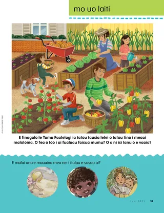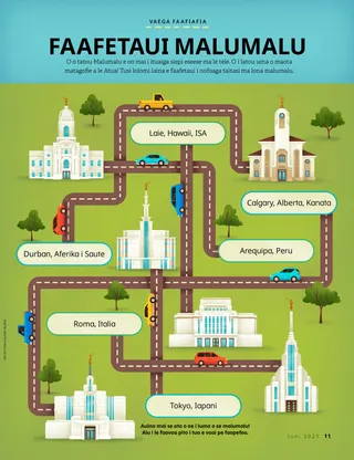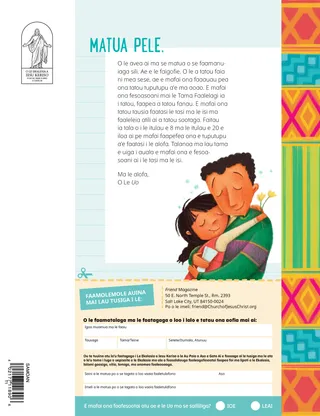 Iuni 2021 Uo PeleO le itulau lenei o loo aofia ai se tusi mai le aufaigaluega ma tusiga mai le fanau e uiga i le auala latou te faitau ai i le Uo. Dallin H. OaksIa AgaleleiNa faamatala e Peresitene Oaks se tala e uiga i se tamaitiiti sulufa’i na ulagia i le ese ai. Sa ia faamalosia tamaiti ia agalelei. Sii mai i se saunoaga i le konafesi aoao. Haley YanceyLauti po o le Vaiinu Mago?Ua faia e Chung le filifiliga e inu le vaiinu aua o le lauti e le faatagaina i le upu o le poto. Ua fesoasoani lana uo, o Jiro, e tu atu mo ia lava pe a faigata, e ui lava e le o Jiro o se tagata o le Ekalesia. Taimi Fiafia i Tusitusiga PaiaO lesona o afiafi faaleaiga e faatatau i faitauga atofaina o le Sau, Mulimuli Mai ia te A’u i vaiaso taitasi. Mo le Mataupu Faavae ma Feagaiga 60–75. Glenda Mendez de LopezO Se Tatalo mo PapiO le Tama o Danna e le’i lelei lona aso, o lea na filifili ai loa Danna e tatalo mo ia ma tusi se tusi faapitoa e ta’u atu ai ia te ia le tele o lona naunautaiga ia te ia. Ua asiasi atu Elder Christofferson i ViatenameAoao e uiga i le asiasiga a Elder D. Todd Christofferson i Viatename. Faafetaui MalumaluLolomi laina ina ia fetaui ma le malumalu i lona nofoaga. Feiloai ia Karles mai Puerto RicoE fiafia Karles e fesoasoani i tagata. Sa ia fesoasoani i tagata ina ua mavae se mafuie malosi ia Ianuari 2020 ma sa auauna atu i le nuu i se taimi mulimuli ane o le tausaga. Aoao atili e uiga ia Karles e ala i le faitauina o le tala. Sa Auauna atu Iesu i IsiNa aoao mai Iesu e taua le auauna atu i isi. Afai tatou te fesoasoani i isi, o le a tatou fiafia. O le itulau lenei o loo aofia ai se gaoioiga e fesoasoani ai i tamaiti e fuafua se auala e auauna atu ai ma se tala mai se tamaitiiti e uiga i le auauna atu i isi. Malaga Asiasi i Puerto Rico faatasi ma Margo ma PaoloE asiasi atu ia Margo ma Paolo i Puerto Rico e aoao ai tamaiti pe faapei mai isi aganuu. Latou te tuuina atu foi se luitau mo tamaiti e auauna atu i o latou nuu. Charlotte LarcabalE pei lava ona ia vaai faalemafaufauO le a papatisoina Kvitka! Ae ona o le faamai o le KOVITI-19, sa na o ni nai tagata na faatagaina e o mai e matamata ia te ia ina ua papatiso. Sa fesoasoani atu lona Tinamatua ia te ia e maua sona lagona lelei. Kata o le Talafaasolopito o le EkalesiaAoao e uiga ia Marie Cardon, o se tagata Italia ua liliu mai ma le faatuatua tele, ma Anthon Lund, o se tagata na liliu mai i le gagana Tenimaka o le na tuputupu a’e e avea ma se peresitene o se misiona ma se Aposetolo. Su’e Mai!Su’e mea o loo natia i le ata. Lori Fuller SosaTaumafai faatasiNa faaletonu Siaki. Sa ee atu lona tina ia te ia, ma sa ia toe ee mai i ai. O le mea lena na faanoanoa ai Siaki. Sa moomoo o ia e lei ee atu lona tina ia te ia, ma sa moomoo o ia na te le’i toe ee mai i ai. Sa filifili o ia ma lona tina e toe taumafai. Manatu LeleiO le savali o lenei masina, “E silafia a’u e le Alii ma e alofa ia te a’u.” Océane P.Sa Papatisoina A’u e Lo’u TuaganeO se tala na tusia e se tamaitiiti e uiga i lona aafiaga i lona papatisoga. Sa aofia lona aiga atoa i lona aafiaga, lea sa manao lava i ai. Faaaloalo mo Mea PaiaE finagalo le Tama Faalelagi ia tatou faaali le faaaloalo i mea faapitoa ma taua na Ia tuuina mai ia i tatou. O le itulau lenei o loo faaalia ai le auala e faaaloalo ma migao ai faapea foi ma le tuuina atu o se gaoioiga e fesoasoani ai e aoao tamaiti i le auala e faaaloalo ai i mea paia. Sharon EubankTasi le Paiso(Peach) i le TaimiUa talanoa mai Sister Sharon Eubank, o le fesoasoani muamua i le au peresitene aoao o le Aualofa, e uiga i ona manatu ma lagona i le valaaulia a Lima Fesoasoani. Sa ia faasoa mai foi se tala e uiga i mea sa ia aoaoina a o piki le fualaauaina paiso ma lona aiga a o avea ma se teineitiiti laitiiti. Fatu OrigamiAoao i le auala e fai ai se fatu origami, ona tusi lea o se faamatalaga agalelei ma tuu atu i se isi tagata! Faaali ma Ta’u AtuO tusiga mai tamaiti i le salafa o le lalolagi o loo talanoa e uiga i aafiaga patino i autu e mai lea auaunaga i le suesueina o tusitusiga paia. Matt ma MandyAta komi: ua aoao ia Matt ma Mandy e uiga i meaalofa faaleagaga i le taimi o se lesona o se afiafi faaleaiga e uiga i le mataupu faavae lona fitu o le faatuatua. Mo Tamaiti MatutuaMotugaafa pe a lagona e tamaiti le lotovaivai, ona gauai atu lea o se tamaitiiti e uiga i le tala o tusitusiga paia e sili ona fiafia i ai, ma se manatu mo se galuega fesoasoani faalilolilo. Lucy Stevenson EwellAna Cumandá Rivera Taylor B.Taoina Falaoa mo La’u MisionaO se gauai mai se tamaitiiti o loo faamatala ai se tala e uiga i le ala na ia taoina ma faatau atu ai falaoa e saili ai se tupe mo lana misiona. O se galuega faigata, ae sa oo ina ia fiafia i ai! Aua Le FiuO se itulau e faapitoa e fesoasoani ai i fanau e atiina ae ni tomai faitio a o latou aoao i le uiga o le i ai o le naunautaiga ma le maufetuunai. Amber HealeyFale Fou o OmbeniO Ombeni na taumafai e maua se sootaga i lana aoga fou i le ISA ina ua uma ona sii mai le Ripapelika Temokarasi o Congo, ae na te le iloa le Igilisi ma e fefe. Ua ia iloa o le auauna atu e mafai ona fesoasoani ia te ia ia maua ai lagona lelei. Luitau mo Tamaiti ma le AutalavouSe gaoioiga e mafai e tamaiti ona fai e uunaia ai i latou e faataunuu tulaga manaomia o le polokalama a tamaiti ma le autalavou. Mo Uo Laiti Migao i le PeraimeriO se tala faavaega na tusia faapitoa mo tamaiti laiti. Ua faaalia e Sione le auala e mafai ai ona ia faaaloalo i le Peraimeri. O le Auso Rollins na faasaoina le aso!O se tala faavaega na tusia faapitoa mo tamaiti laiti. O se tala lenei mai le talafaasolopito o le Ekalesia e uiga ia Mary Elizabeth ma Karoline Rollins, o le na faasaoina uluai kopi o le Mataupu Faavae ma Feagaiga ina ua osofaia e se vaega o tagata leaga lo latou taulaga. E Mafai Ona Ou Lototele!O le savali mo le masina lenei o le, “e mafai ona ou lototele.” Lori Ann RiesO se aso i le matafagaO se tala faavaega e leai se totogi na mamanuina faapitoa mo tamaiti laiti. Ua o se aiga i se matafaga ma vaai i m