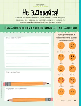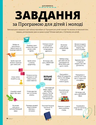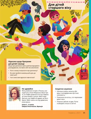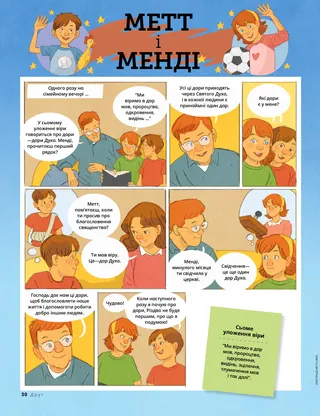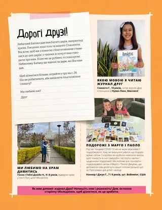 Червень 2021 Дорогі друзі!На цій сторінці міститься лист від редакції і повідомлення від дітей про те, як вони читають журнал Друг. Даллін Х. ОуксБудьте добримиПрезидент Оукс розповідає історію про юнака-біженця, якого дражнили через те, що він відрізнявся від інших. Президент Оукс закликає дітей бути добрими. Адаптовано з виступу на генеральній конференції. Хейлі ЯнсіЧай чи сік манго?Чанг приймає рішення пити сік, тому що вживання чаю суперечить Слову мудрості. Його друг, Джиро, допомагає йому у складній ситуації відстоювати свої вірування, незважаючи на те, що Джиро не є членом Церкви. Час цікавого вивчення ПисаньУроки для домашнього сімейного вечора, основані на щотижневих завданнях для читання за посібником За Мною йдіть. Учення і Завіти 60–75 Гленда Мендес де ЛопесМолитва за папіУ тата Данни був нелегкий день, тому вона вирішила помолитися за нього і написати йому особливого листа про те, як багато він значить для неї. Старійшина Крістофферсон відвідує В’єтнамДізнайтеся про візит старійшини Д. Тодда Крістофферсона до В’єтнаму. Знайди відповідний храмПоєднай лінією храм з відповідним місцем його розташування. Знайомтеся: Карлес з Пуерто-РикоКарлес любить допомагати людям. Він допомагав людям після потужного землетрусу в січні 2020 року і служив місцевим мешканцям упродовж року. Дізнайтеся більше про Карлеса, читаючи про нього статтю. Ісус служив іншимІсус навчав, як важливо служити іншим. Якщо ми допомагаємо людям, то будемо щасливими. На цій сторінці описана вправа, яка допоможе дітям спланувати своє служіння, а також історія дитини, яка розповідає про служіння іншим. Пригоди в Пуерто-Рико з Марго і ПаолоМарго і Паоло відвідують Пуерто-Рико, щоб навчати дітей культурі інших народів. Також вони дають дітям завдання служити у своїх громадах. Шарлотта ЛаркабалЯк вона і уявлялаКвітка збиралася охриститися! Але через пандемію COVID-19 лише кільком людям було дозволено прийти подивитися на її хрищення. Однак бабуся допомогла їй не засмучуватися. Картки з історії ЦерквиДізнайся про Марі Кардон, італійську навернену, яка мала велику віру, а також про Антона Лунда, данського наверненого, який став президентом місії і апостолом. Знайди це на малюнку!Знайди на малюнку сховані предмети. Лорі Фуллер СосаСтаратися разомДжек потрапив у халепу. Мама накричала на нього, а він накричав на неї. Це засмутило Джека. Йому б хотілося, щоб ні мама, ні він не кричали одне на одного. Вони з мамою вирішили спробувати знову. Чудова ідеяОсь послання цього місяця: “Господь знає, хто я, і любить мене”. Осеан П.Мене охристив мій братІсторія, написана дитиною про своє хрищення. Уся сім’я брала участь у цій події, бо саме так дівчинка і хотіла. Повага до священногоНебесний Батько хоче, щоб ми виявляли повагу до того особливого і важливого, що Він нам дав. Ця сторінка присвячена тому, як бути шанобливими і благоговійними, на ній також описано вправу, яка допоможе дітям навчитися виявляти повагу до священного. Шерон ЮбенкПерсик за персикомСестра Шерон Юбенк, перший радник у генеральному президентстві Товариства допомоги, висловлює свої думки і почуття щодо ініціативи “Руки допомоги”. Вона також розповідає історію про те, чого ще дівчинкою навчилася під час збирання персиків зі своєю сім’єю. Серця орігаміДізнайся, як зробити серце орігамі, потім напиши на ньо
