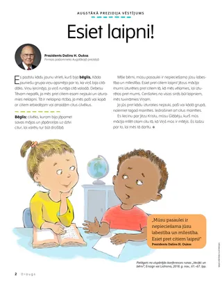 Es pazīstu kādu jaunu vīrieti, kurš bija bēglis. Kāda jauniešu grupa viņu apsmēja par to, ka viņš bija citādāks. Viņu ķircināja, jo viņš runāja citā valodā. Debesu Tēvam nepatīk, ja mēs pret citiem esam nejauki un izturamies nelaipni. Tā ir nelaipna rīcība, ja mēs paši vai kopā ar citiem iebiedējam vai atraidām citus cilvēkus.