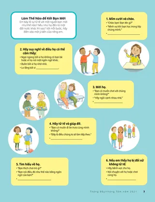 Em bày tỏ sự tử tế với một người bạn mới như thế nào? Nếu như họ đến từ một đất nước khác thì sao? Với mỗi bước, hãy điền vào một ý kiến của riêng em.