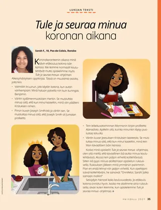Koska minä opiskelin Tule ja seuraa minua -ohjelmaa, olen sitä mieltä, että taivaallinen Isä auttoi minua koulutehtävissä. Alussa tein paljon virheitä kotitehtävissä. Sitten isä pyysi minua aloittamaan opiskelun rukouksella. Rukouksen jälkeen minä ymmärsin paremmin. Pian en enää tehnyt niin paljon virheitä. Kun opettajani saivat kotitehtäväni, he sanoivat: ”Onnittelut, Sarah! Jatka samaan malliin!”