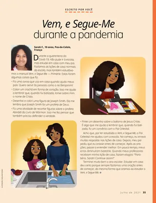 Durante a quarentena da Covid-19, não pude ir à escola, mas estudei em casa com meu pai. Fazíamos as lições de casa normais da escola, mas também estudávamos o manual Vem, e Segue-Me — Primária. Estas foram algumas coisas que fiz: