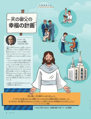 みなさんが生まれる前,天の御父は霊界で,みなさんが御父の幸福の計画を受け入れるか,こばむかを選べるようにされました。御父がそうされた理由は,みなさんを愛しておられるからです。わたしたちは御父の計画にしたがうことを選びました。御父がみなさんにえてほしいと望んでおられる幸福とは,永遠の命です。これは御父のあらゆる賜物の中で最も大いなるものです。