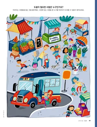 시장에서 사람들을 돕는 마르타 제니퍼 매디 마르타는 엄마랑 시장에 가는 것을 좋아해요. 마르타는 길 잃은 강아지를 보았어요. 마르타는 강아지가 가족을 찾을 수 있도록 기도했어요. “이 강아지 보호자세요?” 마르타가 사람들에게 물었지만, 모두 아니라고 했어요. “파코, 여기 있었구나! 파코를 찾아 주어 고맙다!” 마르타는 사람들을 도울 때 기분이 좋아요! 도움이 필요한 사람은 누구인가요? PDF 열기 마르타는 사람들을 돕는 것을 좋아해요. 시장에 있는 사람들 중 누구를 마르타가 도와줄 수 있을지 찾아보세요. 삽화: 엑토르 볼라스카