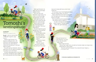 ‘Kijk!’ zegt Tomoshi. Hij wijst naar enkele fleurige bloemen naast de weg.