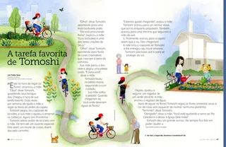 “Oba!”, disse Tomoshi, guardando seus brinquedos. Chegou a hora de sua tarefa favorita. Duas vezes por semana, ele ajuda a mãe a regar as flores do jardim da capela.