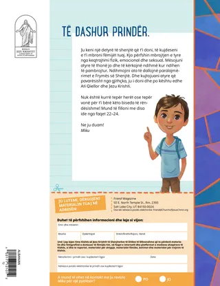 Korrik/Gusht 2021 Të Dashur MiqKjo faqe përfshin një letër nga personeli dhe materialet e dorëzuara nga fëmijët për mënyrën se si ata e lexojnë revistën Miku. Dallin H. OuksJini DashamirësPresidenti Ouks tregon një histori rreth një djali refugjat të cilin e vënë në lojë sepse është ndryshe. Ai i nxit fëmijët të jenë dashamirës. Përshtatur nga një fjalim në konferencën e përgjithshme. Hejli JansiÇaj apo Lëng Mangoje?Çangu merr vendimin të pijë lëng frute sepse çaji është në kundërshtim me Fjalën e Urtësisë. Shoku i tij, Hiro, e ndihmon atë t’i dalë zot vetes kur situata vështirësohet, ndonëse Hiro nuk është anëtar i Kishës. Njihu me Etën nga Samoa AmerikaneNjihu me një vajzë nga Samoa Amerikane që ndihmon si Jezusi. Jezusi i Ndau Gjërat me të TjerëtJezusi ndau bukën dhe peshqit me dishepujt e Tij dhe u tha atyre që të ndihmonin të tjerët. Vendosni një synim që të ndani diçka me dikë tjetër. Aventurat në Samoan Amerikane me Margonë dhe PaolonMëso rreth Samoas Amerikane dhe pranoje sfidën e Duarve Ndihmëtare të këtij muaji. Sharlot LarkabalNjë Ëndërr për DiterinNjë histori me figura që përshkruan udhëtimin e Plakut Diter F. Uhtdorf drejt të bërit pilot avionësh dhe mënyrën se si fëmijët mund të bëhen çfarëdo që dëshirojnë të jenë. Sheron IubankÇdo Herë nga një PjeshkëMotra Sheron Iubank, këshilltare e parë në presidencën e përgjithshme të Shoqatës së Ndihmës, flet rreth mendimeve dhe ndjenjave të saj kundrejt ftesës nga Duart Ndihmëtare. Ajo gjithashtu tregon një histori rreth asaj që ajo mësoi ndërkohë që mblidhte pjeshka me familjen e saj kur ishte vogëlushe. T’Shpëtuesit Dashuri NdiejNjë variant i thjeshtuar i këngës nga Libri i Këngëve të Fëmijëve. Riçard M. RomniReceta e Re e UinfredësUinfreda mëson se shërbimi ndaj të tjerëve e ndihmon atë që të jetë e lumtur. Loja e Tavolinës “Plani i Shpëtimit”Një lojë e hartuar për t’u mësuar fëmijëve rreth planit të shpëtimit dhe për t’i nxitur ata të zgjedhin të drejtën që të arrijnë te mbretëria çelestiale. Trego dhe ThuajMateriale të dorëzuara nga fëmijët nëpër botë që flasin rreth përvojave vetjake me tema që renditen nga pagëzimit te shërbimi dhe familja. Nensi Haruard, Lusi Stivenson IuellVahai TongaVahai qe aq shembull i mirë për miqtë e tij në shkollën me konvikt saqë ata nuk e vunë më në lojë ngaqë lutej. Ata madje filluan të luteshin e të shkonin në kishë me të dhe disa u pagëzuan! Shilla KindrediTë Fshehta dhe SurprizaNjë vajzë e “shpëton” një kukull letre nga dyqani dhe kupton se e vodhi. Ajo vendos t’i thotë mamit në vend që ta mbante të fshehtë. Ajo mëson edhe ndryshimin që ka mes një të fshehte dhe një surprize. Mbroje VetenÇfarë mund të bëjnë dhe thonë fëmijët për të mbrojtur veten nga njerëzit dhe gjërat që i bëjnë ata të ndihen në siklet. Gjithashtu i nxit fëmijët të mendojnë rreth personave me të cilët mund të flasin nëse ka diçka që nuk shkon. Gjeje!Gjeji objektet e fshehura në figurë. Një Vegim për Planin e PerëndisëNjë variant i ilustruar i marrjes së vegimit për planin e shpëtimit nga Jozef Smithi dhe Sidni Rigdoni dhe domethënia e tij për këdo në tokë. Ati Qiellor Ka një Plan për MuaNjë faqe për ngjyrosje e hartuar veçanërisht për fëmijët e vegjël, e përqendruar te plani i Atit Qiellor për lumturinë. Fjala e UrtësisëMëso rreth mënyrës se si e mori Jozef Smithi Fjalën e Urtësisë. Karta për Historinë e Kishës Të Dashur PrindërNjë shënim drejtuar prindërve që i nxit ata t’i mbrojnë fëmijët e tyre nga keqtrajtimi.