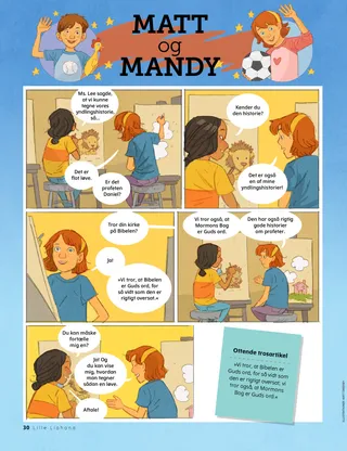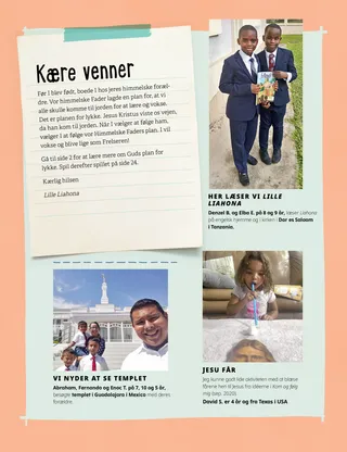 Juli 2021 Kære vennerDenne side omfatter et brev fra medarbejderne og indlæg fra børn om, hvordan de læser Lille Liahona. Henry B. EyringVor himmelske Faders plan for lykkePræsident Henry B. Eyring forklarer årsagerne til, at vor himmelske Fader har skabt frelsesplanen, og hvordan man finder glæde i at vælge det rette. Indeholder også en malebogsside. Richard M. RomneyWinfreds nye opskriftWinfred lærer, at det at tjene andre er med til at gøre hende lykkelig. Sjov tid med skriftenHjemmeaftenlektioner og -aktiviteter er baseret på Kom og følg mig-lektionerne til hver uge i månedens løb. Til Lære og Pagter 76-84. Mary YangEn udsat rejseFreddies far skal rejse til Sydkorea, fordi Freddies bedstefar er meget syg. Freddie vil gerne med sin far, men familien har ikke råd til det. I stedet beder han for sin bedstefar hver dag. Ældste Andersen i ThailandFå mere at vide om ældste Andersens rejse til Thailand. Find det!Find skjulte ting på billedet. Mød Eta fra Amerikansk SamoaMød en pige fra Amerikansk Samoa, der hjælper som Jesus. Jesus delte med andreJesus delte brød og fisk med sine disciple og bad dem om at hjælpe andre. Sæt dig et mål om at dele med nogen. På eventyr i Amerikansk Samoa med Margo og PaoloLær om Amerikansk Samoa, og tag imod denne måneds Hjælpende Hænder-udfordring. Charlotte LarcabalDieters drømEn tegneseriehistorie om ældste Dieter F. Uchtdorfs vej til at blive flypilot, og hvordan børn kan blive hvad som helst, de ønsker. Kort med Kirkens historieLær om Joseph F. Smith, som var Joseph Smiths nevø, og som også blev profet til sidst, og Ma Naoheakamalu Manuhii, som tog sig af præsident Smith, mens han var missionær på Hawaii. Pionerer dengang og nuFind forskellene på disse to pionerbilleder. Sheila KindredHemmeligheder og overraskelserEn pige »redder« en påklædningsdukke fra en butik og indser, at hun stjal den. Hun beslutter at fortælle det til sin mor i stedet for at holde det hemmeligt. Hun lærer også om forskellen på en hemmelighed og en overraskelse. Beskyt jer selvHvad børn kan gøre og sige for at beskytte sig selv mod personer og ting, som de ikke er trygge ved. Børnene opmuntres også til at overveje, hvem de kan snakke med, hvis der er noget galt. Min Frelser elsker migEn forenklet udgave af sangen fra Børnenes sangbog. Brætspillet om frelsesplanenEt spil der er beregnet på at lære børn om frelsesplanen og anspore dem til at vælge det rette for at nå frem til det celestiale rige. Juan Pablo VillarReddet fra sten ved flodenÆldste Juan Pablo Villar fra De Halvfjerds fortæller en historie om, hvordan han sad fast mellem nogle sten, indtil hans bror fandt ham og hjalp ham op. Han bærer vidnesbyrd om, at Jesus vil »trække os væk fra fare«. HuskespilStudér billedet, og se, hvad I kan huske. Vis og fortælIndlæg fra børn rundt om i verden, der fortæller om personlige oplevelser med forskelligt lige fra dåb til tjeneste og familie. Matt og MandyMandy bærer vidnesbyrd om Bibelen og Mormons Bog for sin kristne veninde. Baseret på den ottende trosartikel. For større børnDenne side indeholder et tip til at forberede sig på at gå i templet, en slægtshistorisk idé og et indlæg fra et barn om, hvor meget han glæder sig til et tempel, som skal bygges i nærheden. Nancy Harward, Lucy Stevenson EwellVaha’i TongaVaha’i var et så godt forbillede for sine venner på kostskolen, at de holdt op med at gøre nar af ham, fordi han bad. De begyndte endda at bede og at gå i kirke med ham, og nogle af dem blev døbt! Vov at stå aleneEn side, hvor børnene kan skrive og tegne deres egne historier. Det opmuntrer også børnene til at tænke over, hvad de vil gøre i fremtiden. Sarah F.Kom og følg mig under COVIDUnder pandemien har Sarah lært, at det er vigtigt at bede, når hun skal lære noget nyt, og at hun også må gøre det, inden hun skal lave lektier. Juliann Tenney DomanEt spørgsmål om ærlighedChristy blev nomineret til en pris i skolen, men hun kunne ikke finde ud af, hvad hun skulle svare på spørgsmålene om hende. Hun løj i et af sine svar og fik meget dårlig samvittighed, så hun gik tilbage til skolen for at undskylde. Tegn byenDisse missionærer går rundt i byen og ser efter folk, de kan undervise. Hjælp dem ved at tegne deres by, og nogle mennesker, de kan snakke med! For små venner Hjælper på markedetMarta hjælper en ældre mand med at finde sin forsvundne hund. Hun bliver glad, når hun hjælper andre. Omfatter også en aktivitet, hvor børn ser efter andre mennesker, Marta kan hjælpe. Et syn om Guds planEn illustration af Joseph Smith og Sidney Rigdon, der modtager et syn om frelsesplanen, og hvad den betyder for alle på jorden. Vor himmelske Fader har en plan for mig.En malebogsside til små børn om vor himmelske Faders plan for lykke. Lori Fuller SosaTomoshis yndlingsopgaveTomoshi fik lov til at gå med sin mor hen til kirken hver uge for at vande blomsterne. Det var hans yndlingsopgave, fordi han så så mange smukke ting på vej hen til kirken. Wendy EllisonSmå tingSelv små børn kan gøre ting, der hjælper dem med at lære om evangeliet. Et kort digt med fagter til hver linje. Sjov tid for de små med skriftenDisse idéer passer til Kom og følg mig – Enkeltpersoner og familier hver uge. Særligt til yngre børn. For Lære og Pagter 76-84. Kære forældreEn opmuntrende bemærkning til forældre om at beskytte deres børn mod misbrug.