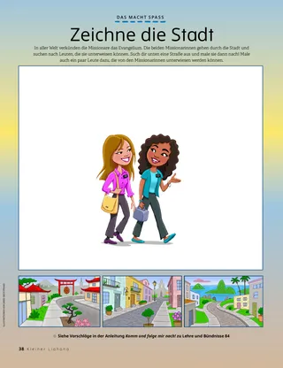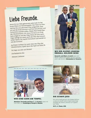 Juli 2021 Liebe FreundeZu dieser Seite gehören Grußworte von der Redaktion sowie Einsendungen von Kindern, die berichten, wo und wann sie im Kleinen Liahona lesen. Henry B. EyringGottes Plan des GlücklichseinsPräsident Henry B. Eyring erklärt, warum der Vater im Himmel den Erlösungsplan aufgestellt hat und inwiefern es uns glücklich macht, das Richtige zu wählen. Zu dem Artikel gehört ein Ausmalbild. Richard M. RomneyWinfreds neues RezeptWinfred lernt, dass sie glücklich ist, wenn sie anderen hilft. Spaß mit den SchriftenLektionen und Aktivitäten für den Familienabend nach den wöchentlichen Leseaufträgen aus der Anleitung Komm und folge mir nach! für diesen Monat. Vorschläge zu Lehre und Bündnisse 76 bis 84 Mary YangDie verschobene ReiseFreddies Vater fliegt nach Südkorea, weil Freddies Großvater sehr krank ist. Freddie möchte ihn begleiten, aber die Familie hat nicht genug Geld. Stattdessen betet er jeden Tag für seinen Opa. Elder Andersen besucht ThailandEin kleiner Bericht über Elder Andersens Besuch in Thailand. SuchbildSuch die versteckten Gegenstände. Eta aus Amerikanisch-SamoaEin Artikel über ein Mädchen aus Amerikanisch-Samoa, das gerne hilft, so wie Jesus es getan hat. Jesus hat geteiltJesus verteilte Brot und Fisch an seine Jünger und trug ihnen auf, anderen zu helfen. Auch die Kinder sollen sich das Ziel setzen, mit jemandem zu teilen. Abenteuer in Amerikanisch-Samoa mit Margo und PaoloEin kurzer Bericht über Amerikanisch-Samoa und der Auftrag für diesen Monat. Charlotte LarcabalDieters TraumEine Bildergeschichte über Elder Dieter F. Uchtdorfs Weg zum Piloten und wie Kinder alles werden können, was sie wollen. Karten zur Geschichte der KircheHier erfährt man etwas über Joseph F. Smith, einem Neffen von Joseph Smith, der später zum Propheten berufen wurde, und Ma Naoheakamalu Manuhii, die sich um Präsident Smith kümmerte, als dieser als Missionar nach Hawaii kam. Pioniere damals und heuteWelche Ähnlichkeiten haben die beiden Bilder? Sheila KindredGeheimnisse und ÜberraschungenEin Mädchen „rettet“ eine Anziehpuppe aus einem Geschäft, doch dann wird ihm bewusst: Es hat sie geklaut! Es vertraut sich seiner Mutter an, anstatt die Sache zu verheimlichen. Es erkennt auch den Unterschied zwischen einem Geheimnis und einer Überraschung. Schütz dich!Was ein Kind tun und sagen kann, um sich vor Leuten und Situationen zu schützen, durch die es sich ungut fühlt. Auch sollen sich die Kinder überlegen, mit wem sie sprechen können, wenn etwas passiert. Des Heilands LiebeEine vereinfachte Version des Liedes aus dem Liederbuch für Kinder. Der Erlösungsplan: ein BrettspielIn diesem Spiel lernen die Kinder den Erlösungsplan besser kennen. Sie sollen das Richtige wählen und so das celestiale Reich erreichen. Juan Pablo VillarRettung am FlussElder Juan Pablo Villar von den Siebzigern berichtet, wie er zwischen zwei Felsen steckengeblieben ist, aber sein Bruder ihn gefunden und gerettet hat. Er bezeugt: Jesus holt uns aus der Gefahr. Was weißt du noch?Schau das Bild an. Was kannst du dir alles merken? Erzähl uns wasEinsendungen von Kindern aus aller Welt mit persönlichen Erlebnissen und verschiedenen Themen wie Taufe, Dienst am Nächsten und Familie. Lukas und LeneLene gibt einer Freundin, die auch gläubig ist, Zeugnis für die Bibel und das Buch Mormon. Basiert auf dem achten Glaubensartikel. Für ältere KinderEin Vorschlag, wie man sich auf den Tempel vorbereiten kann, eine Idee zur Familiengeschichte und eine Einsendung von einem Jungen, der sich darüber freut, dass bei ihm in der Nähe gerade ein Tempel gebaut wird. Nancy Harward, Lucy Stevenson EwellVaha’i TongaVaha’i ist seinen Freunden auf dem Internat so ein großes Vorbild, dass sie sich nicht mehr über ihn lustig machen, wenn er betet. Sie beten sogar mit ihm, begleiten ihn zur Kirche, und ein paar lassen sich taufen. Allein dastehen könnenHier können die Kinder eigene Geschichten aufschreiben oder malen. Sie sollen auch darüber nachdenken, was sie künftig tun wollen. Sarah F.Komm und folge mir nach! während der PandemieWährend der Pandemie wird Sarah bewusst, dass das Gebet nicht nur vor dem Schriftstudium wichtig ist, sondern auch dann, wenn man etwas für die Schule tut, also beispielsweise vor den Hausaufgaben. Juliann Tenney DomanEine Frage der EhrlichkeitChristy wird an ihrer Schule für einen Preis nominiert, ihr fällt aber bei einer Frage keine Antwort ein. Sie lügt, fühlt sich deswegen schrecklich und will sich schließlich dafür entschuldigen. Zeichne die StadtDie beiden Missionarinnen gehen durch die Stadt und suchen nach Leuten, die sie unterweisen können. Hilf ihnen! Zeichne die Stadt und ein paar Leute, mit denen sie sprechen könnten. Für unsere Kleinen Hilfe auf dem MarktMarta hilft einem älteren Herrn, seinen Hund zu finden. Sie fühlt sich gut, wenn sie anderen hilft. Außerdem: eine Aktivität, wo man nach Leuten sucht, denen Marta helfen könnte. Eine Vision vom Plan GottesEine illustrierte Fassung davon, wie Joseph Smith und Sidney Rigdon in einer Vision den Erlösungsplan sehen und was dies für die Menschheit bedeutet. Der himmlische Vater hat einen Plan für michEin Ausmalbild besonders für kleine Kinder; Thema: Gottes Plan des Glücklichseins. Lori Fuller SosaTomoshis LieblingsaufgabeTomoshi begleitet seine Mutter jede Woche zum Gemeindehaus, um dort die Blumen zu gießen. Das macht er besonders gern, denn auf dem Weg zur Kirche sieht er sehr viel Schönes. Wendy EllisonKlein, aber ohoAuch kleinere Kinder können schon etwas tun, um das Evangelium besser zu verstehen. Ein kleines Gedicht mit Bewegungen für jede Zeile. Spaß mit den Schriften für die ganz KleinenDiese Vorschläge passen zu den wöchentlichen Konzepten in der Anleitung Komm und folge mir nach! – Für den Einzelnen und die Familie. Besonders für kleinere Kinder. Vorschläge zu Lehre und Bündnisse 76 bis 84 Liebe Eltern!Ein paar Worte an die Eltern, dass sie ihre Kinde
