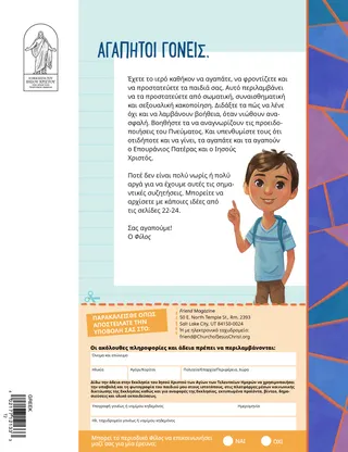 Ιούλιος/Αύγουστος 2021 Αγαπητοί φίλοιΑυτή η σελίδα περιλαμβάνει ένα γράμμα από το προσωπικό και υποβολές από τα παιδιά για το πώς διαβάζουν το περιοδικό Φίλος. Ντάλλιν ΌουκςΝα είστε καλοσυνάτοιΟ Πρόεδρος Όουκς λέει μία ιστορία για ένα προσφυγόπουλο που το πειράζουν επειδή είναι διαφορετικό. Παροτρύνει τα παιδιά να είναι καλοσυνάτα. Προσαρμοσμένο από μία ομιλία γενικής συνελεύσεως. Χέιλυ ΓιάνσυΤσάι ή χυμό μάνγκο;Ο Τσανγκ αποφασίζει να πιει χυμό, επειδή το τσάι είναι ενάντια στον Λόγο Σοφίας. Ο φίλος του, Τζίρο, τον βοηθά να υπερασπισθεί τον εαυτό του, όταν δυσκολεύουν τα πράγματα, μολονότι ο Τζίρο δεν είναι μέλος της Εκκλησίας. Γνωρίστε την Ίτα από την Αμερικανική ΣαμόαΓνωρίστε ένα κορίτσι από την Αμερικανική Σαμόα που βοηθά σαν τον Ιησού. Ο Ιησούς μοιραζόταν με τους άλλουςΟ Ιησούς μοίρασε ψωμί και ψάρια στους μαθητές Του και τους είπε να βοηθήσουν άλλους. Θέστε τον στόχο να μοιράσετε σε κάποιον άλλον. Περιπέτειες στην Αμερικανική Σαμόα με τη Μάργκο και τον ΠάολοΜάθετε για την Αμερικανική Σαμόα και δεχθείτε την πρόκληση για Χείρες Βοηθείας αυτού του μηνός. Σάρλοτ ΛάρκαμπαλΈνα όνειρο για τον ΝτίτερΜία ιστορία σε πλαίσια που περιγράφει το ταξίδι του Πρεσβυτέρου Ντίτερ Ούχτντορφ να γίνει κυβερνήτης αεροπλάνου και πώς τα παιδιά μπορούν να γίνουν ό,τι θέλουν να γίνουν. Σάρον ΓιούμπανκΈνα ροδάκινο τη φοράΗ αδελφή Σάρον Γιούμπανκ, πρώτη σύμβουλος στη γενική προεδρία της Ανακουφιστικής Εταιρείας, μιλά για τις σκέψεις και τα συναισθήματά της σχετικά με την πρόσκληση από τις Χείρες Βοηθείας. Λέει επίσης μία ιστορία για το τι έμαθε όταν μάζευε ροδάκινα με την οικογένειά της ως μικρό κορίτσι. Νιώθω την αγάπη ΤουΜία απλοποιημένη έκδοση του τραγουδιού από το Παιδικό Βιβλίο Τραγουδιών. Ρίτσαρντ ΡόμνυΗ νέα συνταγή της ΓουίνφρεντΗ Γουίνφρεντ μαθαίνει ότι η υπηρέτηση προς τους άλλους την βοηθά να είναι ευτυχισμένη. Επιτραπέζιο παιχνίδι, Σχέδιο σωτηρίαςΈνα παιχνίδι σχεδιασμένο να διδάξει στα παιδιά για το σχέδιο σωτηρίας και να τα παροτρύνει να διαλέξουν το σωστό, ώστε να φθάσουν στο σελέστιο βασίλειο. Δείξε και πεςΥποβολές από παιδιά από όλον τον κόσμο που μιλούν για προσωπικές εμπειρίες με θέματα που καλύπτουν από τη βάπτιση ώς την υπηρέτηση και την οικογένεια. Νάνσυ Χάργουαρντ, Λούσυ Στήβενσον ΓιούελΒαχάι ΤόνγκαΟ Βαχάι ήταν τόσο καλό παράδειγμα για τους φίλους του στο οικοτροφείο, ώστε σταμάτησαν να τον κοροϊδεύουν που προσευχόταν. Άρχισαν μάλιστα να προσεύχονται και να πηγαίνουν στην εκκλησία μαζί του και ορισμένοι βαπτίσθηκαν! Σίλα ΚίντρεντΜυστικά και εκπλήξειςΈνα κορίτσι «διασώζει» μία χάρτινη κούκλα από ένα κατάστημα και συνειδητοποιεί ότι την έκλεψε. Αποφασίζει να το πει στη μαμά της, αντί να το κρατήσει μυστικό. Μαθαίνει επίσης ποια είναι η διαφορά μεταξύ ενός μυστικού και μίας έκπληξης. ΠροστατευτείτεΤι μπορούν να κάνουν και να πουν τα παιδιά για να είναι ασφαλή από ανθρώπους και πράγματα που τα κάνουν να νιώθουν άβολα. Παροτρύνει επίσης τα παιδιά να σκεφθούν σε ποιον μπορούν να μιλήσουν, αν συμβαίνει κάτι. Βρείτε το!Βρείτε τα κρυμμένα αντικείμενα στην εικόνα. Ένα όραμα του σχεδίου του ΘεούΜία εικονογραφημένη έκδοση με τον Τζόζεφ Σμιθ και τον Σίδνεϋ Ρίνγκτον να λαμβάνουν το όραμα του σχεδίου σωτηρίας και τι σημαίνει αυτό για όλους επάνω στη γη. Ο Επουράνιος Πατέρας έχει ένα σχέδιο για μέναΜία σελίδα χρωματισμού σχεδιασμένη 