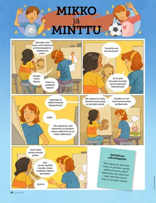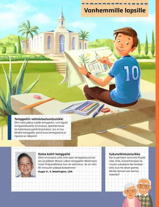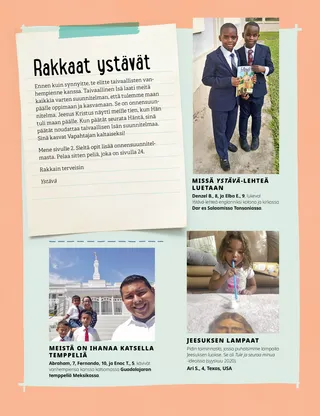 Heinäkuu 2021 Rakkaat ystävätTällä sivulla on kirje toimituskunnalta ja lasten kertomuksia siitä, kuinka he lukevat Ystävä-lehteä. Henry B. EyringTaivaallisen Isän onnensuunnitelmaPresidentti Henry B. Eyring selittää syitä siihen, miksi taivaallinen Isä laati onnensuunnitelman ja kuinka voi tuntea onnea valitsemalla oikein. Sisältää myös värityskuvan. Richard M. RomneyWinfredin uusi reseptiWinfred oppii, että muiden palveleminen auttaa häntä olemaan onnellinen. Iloa pyhistä kirjoituksistaPerheiltaoppiaiheita ja toimintoja, jotka perustuvat Tule ja seuraa minua -oppiaiheisiin kuukauden jokaiselle viikolle. Oppi ja liitot 76–84. Mary YangLykkääntynyt matkaFreddien isä lähtee Etelä-Koreaan, koska Freddien vaari on hyvin sairas. Freddie haluaa lähteä isän mukaan, mutta perheellä ei ole riittävästi rahaa. Sen sijaan Freddie rukoilee vaarinsa puolesta joka päivä. Vanhin Andersen vierailee ThaimaassaLue vanhin Andersenin vierailusta Thaimaahan. Etsi!Etsi kuvaan piilotetut eläimet ja asiat. Tutustu Etaan Amerikan SamoastaTutustu Amerikan Samoassa olevaan tyttöön, joka auttaa Jeesuksen lailla. Jeesus antoi omastaan muilleJeesus jakoi leipää ja kalaa opetuslapsilleen ja käski heidän auttaa muita. Aseta tavoite jakaa jotakin jonkun kanssa. Seikkailuja Amerikan Samoassa Margon ja Paolon seurassaTutustu Amerikan Samoaan ja osallistu tämän kuukauden Auttavat kädet -haasteeseen. Charlotte LarcabalDieterin unelmaSarjakuvatarina, joka kuvaa vanhin Dieter F. Uchtdorfin matkaa lentäjäksi ja sitä, kuinka lapsista voi tulla mitä tahansa he haluavat olla. Kirkon historia -kortitOpi Joseph F. Smithistä, joka oli Joseph Smithin veljenpoika ja josta tuli lopulta profeetta, sekä Ma Naoheakamalu Manuhiista, joka hoiti presidentti Smithiä tämän ollessa lähetyssaarnaajana Havaijissa. Pioneereja silloin ja nytEtsi näiden kahden pioneerikuvan eroavuudet. Sheila KindredSalaisuuksia ja yllätyksiäTyttö ”pelastaa” paperinuken kaupasta ja tajuaa, että hän varasti sen. Hän päättää kertoa siitä äidilleen sen sijaan että pitäisi sen salassa. Hän oppii myös, mitä eroa on salaisuuden ja yllätyksen välillä. Suojele itseäsiMitä lapset voivat tehdä ja sanoa pysyäkseen turvassa ihmisiltä ja asioilta, jotka tekevät heidän olonsa epämukavaksi. Kannustaa lapsia myös ajattelemaan sitä, kenelle he voivat puhua, jos jokin on vialla. Mua Jeesus rakastaaYksinkertaistettu versio Lasten laulukirjan laulusta. Pelastussuunnitelma -lautapeliPeli, jonka tarkoituksena on opettaa lapsille pelastussuunnitelmaa ja kannustaa heitä valitsemaan oikein, jotta he pääsevät selestiseen valtakuntaan. Juan Pablo VillarPelastus rantakivien välistäVanhin Juan Pablo Villar seitsemänkymmenen koorumista kertoo siitä, kuinka hän juuttui kivien väliin, kunnes hänen isoveljensä löysi hänet ja auttoi hänet sieltä pois. Hän todistaa, että Jeesus ”vetää meidät pois vaarasta”. MuistipeliTutki kuvaa ja ota selville, mitä pystyt muistamaan. YstäviltäEri puolilla maailmaa asuvat lapset kertovat omia kokemuksiaan eri aiheista, kuten kasteesta, palvelemisesta ja perheestä. Mikko ja MinttuMinttu saa lausua todistuksensa Raamatusta ja Mormonin kirjasta kristitylle ystävälleen. Perustuu kahdeksanteen uskonkappaleeseen. Vanhemmille lapsilleTällä sivulla on vinkki temppeliin valmistautumisesta, sukututkimusidea ja erään lapsen ajatuksia siitä, kuinka innoissaan hän on lähelle rakennettavasta temppelistä. Nancy Harward ja Lucy Stevenson EwellVaha’i TongaVaha’i oli niin hyvä esimerkki ystävilleen sisäoppilaitoksessa, että he lakkasivat pilkkaamasta häntä rukoilemisesta. He alkoivat jopa rukoilla ja käydä kirkossa hänen kanssaan, ja jotkut kastettiin! Rohkeutta seistä yksinSivu, jolle lapset voivat kirjoittaa ja piirtää omia tarinoitaan. Se myös kannustaa lapsia miettimään, mitä he aikovat tehdä tulevaisuudessa. Sarah F.Tule ja seuraa minua koronan aikanaPandemian aikana Sarah oppi, että on tärkeää rukoilla aina kun opiskelee – ja että se tarkoittaa rukoilemista myös ennen läksyjen aloittamista. Juliann Tenney DomanRehellisyyskysymysChristy nimettiin saamaan koulusta palkinto, mutta hän ei keksinyt vastauksia kyselyyn. Hän valehteli yhdessä vastauksistaan, ja se tuntui kamalalta, joten hän meni takaisin kouluun pyytämään anteeksi. Piirrä kaupunkiNämä lähetyssaarnaajat kävelevät ympäri kaupunkia etsien opetettavia ihmisiä. Auta heitä piirtämällä heidän kaupunkinsa ja ihmisiä, joiden kanssa he voivat puhua! Pikku ystäville Auttamassa torillaMarta auttaa iäkästä miestä löytämään kadonneen koiransa. Martasta tuntuu hyvältä, kun hän auttaa muita. Sisältää myös toiminnan, jossa lapset etsivät muita ihmisiä, joita Marta voi auttaa. Näky Jumalan suunnitelmastaKuvitettu kertomus siitä, kun Joseph Smith ja Oliver Cowdery saavat näyn pelastussuunnitelmasta, ja siitä, mitä se merkitsee jokaiselle maan päällä. Taivaallisella Isällä on suunnitelma minua vartenVärityskuva, joka on tarkoitettu erityisesti pienille lapsille ja joka keskittyy taivaallisen Isän onnensuunnitelmaan. Lori Fuller SosaTomoshin lempityöTomoshi pääsi äitinsä kanssa kastelemaan kukkia kirkolle joka viikko. Se oli hänen lempityönsä, koska hän sai nähdä kaikenlaista kaunista matkalla kirkolle. Wendy EllisonPieniä asioitaPienetkin lapset voivat tehdä asioita, jotka auttavat heitä oppimaan evankeliumia. Lyhyt loru, jossa on liike joka riville. Iloa pyhistä kirjoituksista pienemmilleNämä ideat liittyvät viikoittaisiin Tule ja seuraa minua – sinä ja perheesi ‑aiheisiin. Tarkoitettu erityisesti pienille lapsille. Lukuihin Oppi ja liitot 76–84. Rakkaat vanhemmatViesti vanhemmille rohkaisemaan heitä suojelemaan lapsiaan väkivallalta.