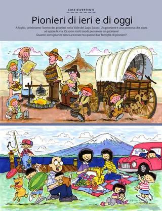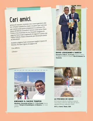 Luglio 2021 Cari amiciQuesta pagina include una lettera della redazione e i contributi dei bambini che spiegano come leggono L’Amico. Henry B. EyringIl piano di felicità del Padre CelesteIl presidente Henry B. Eyring spiega perché il Padre Celeste ha creato il piano di salvezza e come trovare felicità scegliendo il giusto. Include anche una pagina da colorare. Richard M. RomneyLa nuova ricetta di WinfredWinfred impara che servire gli altri la aiuta a essere felice. È ora di divertirsi con le ScrittureLezioni e attività per la serata familiare basate sugli schemi di Vieni e seguitami per ogni settimana del mese. Per Dottrina e Alleanze 76–84 Mary YangUn viaggio rimandatoIl papà di Freddie parte per la Corea del Sud perché il nonno di Freddie è molto malato. Freddie vuole andare con il papà, ma la sua famiglia non ha abbastanza denaro. Allora prega per il nonno ogni giorno. L’anziano Andersen visita la ThailandiaScopri di più sulla visita dell’anziano Andersen in Thailandia. Trova gli oggetti!Trova gli oggetti nascosti nell’immagine. Incontriamo Eta dalle Samoa AmericaneIncontra una bambina delle Samoa Americane che aiuta come faceva Gesù. Gesù condivideva con gli altriGesù condivise il pane e i pesci con i Suoi discepoli e disse loro di aiutare gli altri. Poniti la meta di condividere qualcosa con qualcuno. Avventure nelle Samoa Americane con Margo e PaoloScopri di più sulle Samoa Americane e accetta la sfida della squadra Helping Hands di questo mese! Charlotte LarcabalUn sogno per DieterUna storia a fumetti che racconta del percorso dell’anziano Dieter F. Uchtdorf per diventare un pilota di aereo e di come i bambini possono diventare tutto quello che desiderano essere. Schede sulla storia della ChiesaImpara a conoscere Joseph F. Smith, nipote di Joseph Smith e profeta, e Ma Naoheakamalu Manuhii, che si prese cura del presidente Smith quando era un missionario alle Hawaii. Pionieri di ieri e di oggiTrova le differenze tra queste due immagini di pionieri. Sheila KindredSegreti e sorpreseUna ragazzina “salva” una bambola di carta da un negozio e si rende conto di averla rubata. Decide di dirlo alla mamma invece che tenerlo segreto. Impara anche la differenza tra un segreto e una sorpresa. Proteggi te stessoCiò che i bambini possono fare e dire per tenersi al sicuro dalle persone e dalle cose che li fanno sentire a disagio. Inoltre, incoraggia i bambini a pensare a qualcuno con cui possono parlare se qualcosa non va. Io sento attorno a meUna versione semplificata dell’inno presente nell’Innario dei bambini. Gioco da tavolo del piano di salvezzaUn gioco pensato per insegnare ai bambini il piano di salvezza e incoraggiarli a scegliere il giusto per raggiungere il regno celeste. Juan Pablo VillarSalvataggio dalle rocce del fiumeL’anziano Juan Pablo Villar dei Settanta racconta la storia di come è rimasto incastrato tra alcune rocce finché il suo fratello maggiore non lo ha trovato e liberato. Rende testimonianza che Gesù ci “toglierà dal pericolo”. Gioco di memoriaStudia l’immagine e scopri cosa riesci a ricordare. Mostra e raccontaMateriale inviato da bambini di tutto il mondo che parlano di esperienze personali su argomenti che vanno dal battesimo al servizio e alla famiglia. Matt e MandyMandy ha la possibilità di rendere la sua testimonianza sulla Bibbia e sul Libro di Mormon a una sua amica cristiana. Basato sull’ottavo articolo di fede. Per i bambini più grandiQuesta pagina contiene un suggerimento per prepararsi ad andare al tempio, un’idea per la storia familiare e del materiale inviato da un bambino molto emozionato per la costruzione di un tempio vicino a lui. Nancy Harward, Lucy Stevenson EwellVaha’i TongaIn collegio, Vaha’i era un tale esempio che i suoi amici smisero di prenderlo in giro perché pregava. Iniziarono persino a pregare e ad andare in chiesa con lui, e alcuni furono battezzati! Il coraggio di stare soliUna pagina pensata in modo che i bambini scrivano e disegnino le loro storie personali. Inoltre, incoraggia i bambini a pensare a quello che faranno in futuro. Sarah F.Vieni e seguitami durante il COVIDDurante la pandemia, Sarah ha imparato che pregare è importante a prescindere da cosa si studi, anche prima di iniziare a fare i compiti. Juliann Tenney DomanLa domanda dell’onestàChristy è stata candidata a ricevere un premio a scuola, ma non ha saputo rispondere alle risposte per il questionario. Ha mentito in una delle risposte e si è sentita malissimo, così è tornata a scuola per scusarsi. Disegna la cittàQueste missionarie stanno camminando per la città cercando persone a cui insegnare. Aiutale disegnando la loro città e alcune persone con cui possono parlare! Per i piccoli amici Aiutare al mercatoMarta aiuta un signore anziano a trovare il suo cane smarrito. Si sente bene quando aiuta gli altri. Contiene anche un’attività in cui i bambini cercano altre persone che Marta può aiutare. Una visione del piano di DioUna versione illustrata dell’episodio in cui Joseph Smith e Sidney Rigdon hanno una visione del piano di salvezza e di ciò che significa per tutte le persone della terra. Il Padre Celeste ha un piano per meUna pagina da colorare pensata espressamente per i bambini piccoli, incentrata sul piano di felicità del Padre Celeste. Lori Fuller SosaIl lavoro preferito di TomoshiOgni settimana, Tomoshi andava con la mamma all’edificio della Chiesa per annaffiare i fiori. Era la cosa che preferiva fare perché poteva vedere ogni genere di cose belle lungo la strada che li portava in chiesa. Wendy EllisonPiccolo è belloAnche i bambini piccoli possono fare cose che li aiuteranno a imparare il Vangelo. Una breve poesia corredata di azioni per ogni verso. È ora di divertirsi con le Scritture per i più piccoliQueste idee corrispondono ogni settimana alle lezioni di Vieni e seguitami – Per gli individui e le famiglie. Pensate espressamente per i bambini più piccoli. Per Dottrina e Alleanze 76–