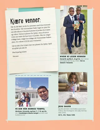 Juli 2021 Kjære vennerDenne siden inneholder et brev fra personalet og bidrag fra barn om hvordan de leser Vennen. Henry B. EyringVår himmelske Faders plan for lykkePresident Henry B. Eyring forklarer grunnene vår himmelske Fader har for å skape frelsesplanen og hvordan vi kan finne lykke ved å velge det rette. Inneholder også en fargeleggingsside. Richard M. RomneyWinfreds nye oppskriftWinfred lærer at å tjene andre hjelper henne å være lykkelig. Moro med SkrifteneHjemmeaften-leksjonene og -aktivitetene er basert på leksjonene i Kom, følg med meg for hver uke i måneden. Lære og pakter 76–84 Mary YangEn utsatt reiseFreddies pappa drar til Sør-Korea fordi Freddies bestefar er veldig syk. Freddie ønsker å dra sammen med sin pappa, men familien har ikke nok penger. Han ber for sin bestefar hver dag isteden. Eldste Andersen besøker ThailandLær om eldste Andersens besøk i Thailand. Finn den!Finn de skjulte gjenstandene på bildet. Møt Eta fra Amerikansk SamoaMøt en pike fra Amerikansk Samoa som hjelper slik Jesus gjorde. Jesus delte med andreJesus delte brød og fisk med disiplene sine og sa at de skulle hjelpe andre. Sett deg et mål om å dele med andre. På eventyr i Amerikansk Samoa med Margo og PaoloLær om Amerikansk Samoa og ta denne månedens Hjelpende hender-utfordring. Charlotte LarcabalDieters drømEn panelhistorie som beskriver eldste Dieter F. Uchtdorfs reise til å bli flyver og hvordan barn kan bli det de ønsker å bli. Kort om Kirkens historieLær om Joseph F. Smith, som var Joseph Smiths nevø og til slutt ble profet, og Ma Naoheakamalu Manuhii, som tok seg av president Smith mens han var misjonær på Hawaii. Pionerer da og nåFinn forskjellene mellom disse to pioner-bildene. Sheila KindredHemmeligheter og overraskelserEn pike “redder” en papirdukke fra en butikk og innser at hun stjal den. Hun bestemmer seg for å fortelle det til mammaen sin istedenfor å holde det hemmelig. Hun lærer også hva som er forskjellen på en hemmelighet og en overraskelse. Beskytt deg selvHva barn kan gjøre og si for å holde seg trygge fra folk og ting som gjør dem utilpass. Oppfordre også barn til å tenke på hvem de kan snakke med hvis noe er galt. Min Frelsers kjærlighetEn forenklet versjon av sangen fra Barnas sangbok. Frelsesplanen – brettspillEt spill laget for å undervise barn om frelsesplanen og oppmuntre dem til å velge det rette og nå Det celestiale rike. Juan Pablo VillarRedning i River RockEldste Juan Pablo Villar i De sytti forteller en historie om hvordan han ble sittende fast mellom noen steiner helt til storebroren fant ham og hjalp ham løs. Han vitner om at Jesus vil “fri oss ut fra fare”. Memo-spillStuder bildet og se hva du kan huske. Vis og fortellBidrag fra barn over hele verden som snakker om personlige erfaringer med alt fra dåp til tjeneste og familie. Matt og MandyMandy får bære vitnesbyrd om Bibelen og Mormons bok til sin kristne venn. Basert på den åttende trosartikkel. For eldre barnDenne siden inneholder et tips for å forberede seg til å dra til tempelet, en idé for slektshistorie og et bidrag fra et barn om hvor glad han er for at det skal bygges et tempel i nærheten. Nancy Harward, Lucy Stevenson EwellVaha’i TongaVaha’i var et så godt eksempel for sine venner på kostskolen at de sluttet å gjøre narr av ham fordi han ba. De begynte til og med å be og gå i kirken sammen med ham, og noen ble døpt! Mot til å stå aleneEn side laget for barn der de kan skrive ned og tegne sine egne historier. Den oppmuntrer også barn til å tenke på hva de vil gjøre i fremtiden. Sarah F.Kom, følg med meg under covidUnder pandemien fant Sarah ut at det er viktig å holde bønn under et hvilket som helst studium, og det gjelder også før hun begynner med leksene. Juliann Tenney DomanÆrlighetsspørsmåletChristy ble nominert til en utmerkelse på skolen, men hun kunne ikke komme på svar på spørsmålene. Hun løy i et av svarene sine og følte seg forferdelig, så hun gikk tilbake til skolen for å be om unnskyldning. Tegn byenDisse misjonærene går rundt i byen og ser etter mennesker som de kan undervise. Hjelp dem ved å tegne byen deres og noen de kan snakke med! For våre små venner Marta hjelper til på markedetMarta hjelper en eldre mann å finne den bortkomne hunden hans. Hun føler godt når hun hjelper andre. Inneholder også en aktivitet der barna ser etter andre som Marta kan hjelpe. Et syn om Guds planEn illustrert versjon av Joseph Smith og Oliver Cowdery som mottar et syn om frelsesplanen og hva den betyr for alle på jorden. Vår himmelske Fader har en plan for megEn fargeleggingsside laget spesielt for små barn, med fokus på vår himmelske Faders plan for lykke. Lori Fuller SosaTomoshis yndlingsjobbTomoshi fikk være med mammaen sin for å vanne blomstene ved kirkebygningen hver uke. Det var det beste han visste fordi han fikk se alle slags vakre ting på vei til kirken. Wendy EllisonSmå tingSelv små barn kan gjøre ting som vil hjelpe dem å lære om evangeliet. Et kort dikt med handlinger for hver linje. Moro med Skriftene for de småDisse forslagene går hånd i hånd med Kom, følg med meg – for enkeltpersoner og familier hver uke. Spesielt laget for yngre barn. Lære og pakter 76–84 Kjære foreldreEn beskjed til foreldre som oppmuntrer dem til å beskytte sine barn mot overgrep.