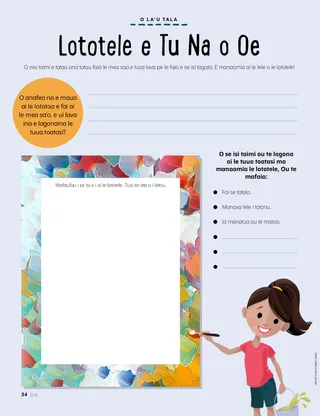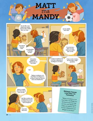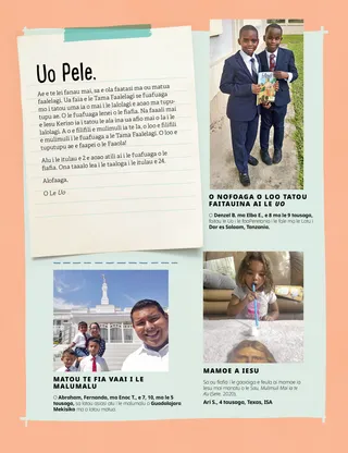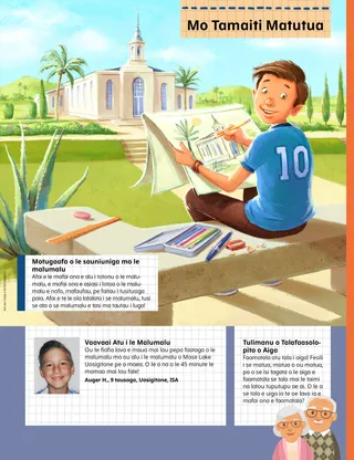 Iulai 2021 Uo PeleO le itulau lenei o loo aofia ai se tusi mai le aufaigaluega ma tusiga mai le fanau e uiga i le auala latou te faitau ai i le Uo. Henry B. EyringO Le Fuafuaga o le Fiafia a le Tama FaalelagiUa faamalamalama mai e Peresitene Henry B. Eyring mafuaaga o loo i ai i le Tama Faalelagi mo le fatuina o le ata o le faaolataga ma le auala e maua ai le fiafia i le filifiliina o le mea sao. E aofia ai foi se itulau e valivali. Richard M. RomneyFua fou a WinfredNa aoaoina e Winfred o le auauna atu i isi e fesoasoani ia te ia ia maua ai le fiafia. Taimi Fiafia i Tusitusiga PaiaLesona o afiafi faaleaiga ma gaoioiga e faavae i lesona o le Sau, Mulimuli Mai ia te A’u mo vaiaso taitasi o le masina. Mo le Mataupu Faavae ma Feagaiga 76–84. Mary YangO Se Malaga Ua TolopoinaNa alu le Tama o Freddie i Korea i Saute ona sa mai tigaina le tamamatua a Freddie. E manao Freddie e o ma lona tama, ae e le o lava tupe a lona aiga. Sa tatalo o ia mo lona tama matua i aso uma. Ua Asiasi Elder Andersen i TaialaniAoao e uiga i le asiasiga a Elder Andersen i Taialani. Su’e Mai!Su’e mea o loo natia i le ata. Feiloai ma Eta mai Amerika SamoaFeiloai atu i se teine mai Amerika Samoa o le e fesoasoani e pei o Iesu. Sa Faasoa atu Iesu ma IsiNa faasoa atu e Iesu le areto ma i’a i Ona soo ma tau atu ia i latou e fesoasoani atu i isi. Faatu se sini e faasoa atu ma se isi tagata. Malaga Asiasi i Amerika Samoa faatasi ma Margo ma PaoloAoao e uiga ia Amerika Samoa ma fai le lui o lima fesoasoani o le masina lenei. Charlotte LarcabalO Se Miti Mo DieterO se tala i le vaega o loo faamatalaina ai le malaga a Elder Dieter F. Uchtdorf i le avea ma se pailate vaalele ma le auala e mafai ai ona avea fanau ma soo se mea latou te mananao e avea ai. Kata o le Talafaasolopito o le EkalesiaAoao e uiga ia Iosefa F. Samita, o le atalii o le uso o Iosefa Samita ma iu ai ina avea ma perofeta, ma tina Naoheakamalu Manuhii, o le sa tausia Peresitene Samita ao avea o ia ma se faifeautalai i Hawaii. Paionia o Aso La ma Aso NeiSaili le eseesega i le va o nei ata paionia e lua. Sheila KindredMealilo ma Mea e Faateia AiSa “laveaia” e se teineitiiti se pepa pepe meataalo mai se faleoloa ma sa ia iloa ifo sa ia gaoia. Na ia filifili e tau atu i lona tina nai lo le tausisia o se mealilo. Na ia aoao ai foi po o le a le eseesega i le va o se mealilo ma se mea e faateia ai. Puipui Oe LavaO mea e mafai ona fai ma fai atu e fanau ina ia tausia ai i latou lava ia saogalemu mai i tagata ma mea latou te le maua ai le le mautonu. Ia uunaia foi tamaiti e mafaufau po o ai e mafai ona latou talanoa i ai pe afai e i ai se mea ua sese. Le Alofa o lou FaaolaSe lomiga faigofie o le pese mai le Tusipese a Tamaiti. Taaloga laupapa o le Ata o le FaaolatagaO se taaloga na mamanuina e aoao ai le fanau e uiga i le ata o le faaolataga ma uunaia ai i latou e filifili le mea sao e taunuu atu ai i le malo selesitila. Juan Pablo VillarLaveai Mai le Ma’a VaitafeNa faasoa mai e Elder Juan Pablo Villar o le Au Fitugafulu se tala e uiga i le ala na mau ai o ia i le va o ni maa seia oo ina maua e lona uso matua ma fesoasoani ia te ia. Ua ia molimau mai o Iesu o le a “tosoina i tatou mai mea matautia.” Taaloga FaamanatuSuesue le ata ma vaai po o le a le mea e mafai ona e manatua. Faaali ma Ta’u AtuO tusiga mai tamaiti i le salafa o le lalolagi o loo talanoa e uiga i aafiaga patino i autu e mai le papatisoga i le auaunaga ma le aiga. Matt ma MandyE maua e Mandy le avanoa e tuuina atu ai lana molimau e uiga i le Tusi Paia ma le Tusi a Mamona i lana uo Kerisiano. E faavae i le Mataupu Faavae o le Faatuatua lona valu. Mo Tamaiti MatutuaO le itulau lenei o loo aofia ai se Motugaafa mo le saunia e alu i le malumalu, se manatu o talafaasolopito o aiga, ma se gauai atu mai se tamaitiiti e uiga i lona fiafia i se malumalu o le a fausia latalata ane. Saunia e Nancy Harward ma Lucy Stevenson EwellVaha‘i TogaO Vaha‘i o se faataitaiga lea i ana uo i le aoga nofotumau lea na latou le toe ulagia ai o ia mo le tatalo. Sa amata foi ona latou tatalo ma o i le lotu faatasi ma ia, ma o nisi na papatisoina! Lototele e Tu Na o OeO se itulau na mamanuina mo tamaiti e tusi i lalo ma tusi a latou lava tala. E uunaia ai foi tamaiti e mafaufau e uiga i mea o le a latou faia i le lumanai. Sara F.Sau, Mulimuli Mai ia te A’u i le taimi o le KOVITII le taimi o le faama’i, sa iloa ai e Sara o le tatalo e taua tele i le faia i soo se ituaiga o suesuega, ma e aofia ai a o lei amataina lana meaaoga. Juliann Tenney DomanO Le Fesili o le FaamaoniSa filifilia Christy mo se faailoga i le aoga, ae sa le mafai ona ia mafaufau i tali mo le suesuega. Sa pepelo o ia i se tasi o ana tali ma sa lagona le le lelei, o lea sa ia toe foi ai i le aoga e faatoese atu. Tusi le taulagaO loo savavali nei faifeautalai i le taulaga ma vaavaai mo tagata e aoao. Fesoasoani ia i latou e ala i le tusiaina o o latou taulaga ma nisi o tagata e mafai ona latou talanoa i ai! Mo Uo Laiti Fesoasoani atu i le MaketiUa fesoasoani Marta i se toeaina matua e sue lana taifau na leiloa. E lelei ona lagona pe a ia fesoasoani i isi. O loo aofia ai foi se gaoioiga e sue ai e tamaiti isi tagata mo Marta e fesoasoani atu i ai. O se Faaaliga o le Fuafuaga a le AtuaO se ata faamatala o Iosefa Samita ma Oliva Kaotui na mauaina se faaaliga o le ata o le faaolataga ma lona uiga mo tagata uma i le lalolagi. O loo i ai se Fuafuaga a le Tama Faalelagi mo A’uO se itulau valivali ua mamanuina faapitoa mo tamaiti laiti, e taulai atu i le fuafuaga o le fiafia a le Tama Faalelagi. Lori Fuller SosaGaluega e Sili ona Fiafia i ai TomoshiNa o Tomoshi ma lona tina e fui fugalaau i le fale lotu i vaiaso taitasi. O lana mea sa sili ona ia fiafia i ai e fai aua na te vaaia mea matagofie uma i le ala i le lotu. Wendy EllisonMea ItiitiE oo foi i tamaiti laiti e mafai ona latou faia mea o le a fesoasoani ia i latou e aoao ai e uiga i le talalelei. O se solo puupuu o loo i ai ni faatinoga mo laina taitasi. Taimi Fiafia i Tusitusiga Paia mo Fanau