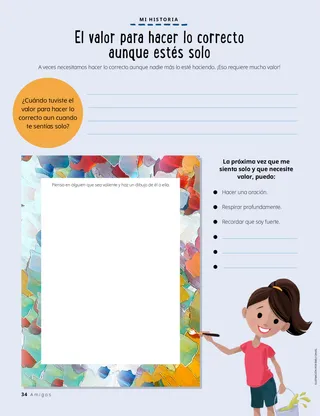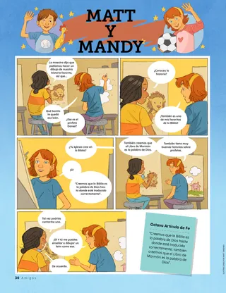 Julio de 2021 Estimados amigosEsta página incluye una carta del personal y envíos de los niños sobre cómo leen la revista Amigos. Henry B. EyringEl plan de felicidad del Padre CelestialEl presidente Henry B. Eyring explica las razones por las que el Padre Celestial creó el Plan de Salvación, y cómo hallar felicidad al escoger lo correcto. Incluye también una página para colorear. Richard M. RomneyLa nueva receta de WinfredWinfred descubre que prestar servicio a los demás la ayuda a ser feliz. Momentos alegres con las EscriturasLecciones y actividades para la noche de hogar basadas en las lecciones de Ven, sígueme para cada semana del mes. Para Doctrina y Convenios 76–84 Mary YangEl viaje que se suspendióEl papá de Freddie va a Corea del Sur porque el abuelito de Freddie está muy enfermo. Freddie quiere ir con su papá, pero su familia no tiene suficiente dinero. En cambio, él ora cada día por su abuelito. El élder Andersen visita TailandiaAprende sobre la visita del élder Andersen a Tailandia. ¡Encuéntralos!Encuentra los objetos que están ocultos en la ilustración. Conoce a Eta, de Samoa EstadounidenseConoce a una niña de Samoa Estadounidense que ayuda como lo hizo Jesús. Jesús compartió con los demásJesús compartió pan y pescado con Sus discípulos y les dijo que ayudaran a los demás. Ponte la meta de compartir con otra persona. Aventuras en Samoa Estadounidense con Margo y PaoloAprende sobre Samoa Estadounidense y acepta el desafío de Manos que Ayudan de este mes. Charlotte LarcabalUn sueño para DieterUna historieta que describe el recorrido del élder Dieter F. Uchtdorf para llegar a ser piloto de avión y cómo los niños pueden convertirse en lo que quieran ser. Tarjetas de la historia de la IglesiaAprende sobre Joseph F. Smith, que fue sobrino de José Smith y finalmente el profeta, y sobre Ma Naoheakamalu Manuhii, que cuidó del presidente Smith mientras él era misionero en Hawái. Pioneros antes y ahoraEncuentra las diferencias entre estas dos ilustraciones de pioneros. Sheila KindredSecretos y sorpresasUna niña “rescata” una muñeca de papel de una tienda y se da cuenta de que la robó. Decide decírselo a su madre en lugar de mantenerlo en secreto. También aprende cuál es la diferencia entre un secreto y una sorpresa. ProtégeteLo que los niños pueden hacer y decir para protegerse de las personas y las cosas que los hacen sentir incómodos. También anima a los niños a pensar con quién pueden hablar si algo anda mal. Siento el amor de mi SalvadorUna versión simplificada de la canción que se encuentra en Canciones para los niños. Juego de mesa del Plan de SalvaciónUn juego diseñado para enseñar a los niños sobre el Plan de Salvación y animarlos a escoger lo correcto para llegar al Reino Celestial. Juan Pablo VillarRescate de las rocas del ríoEl élder Juan Pablo Villar, de los Setenta, cuenta un relato de cómo quedó atrapado entre unas rocas hasta que su hermano mayor lo encontró y lo ayudó. Él testifica que Jesús “nos sacará del peligro”. Juego de memoriaEstudia la imagen para ver qué puedes recordar. Muestra y cuéntaloEnvíos de niños de todo el mundo, que hablan sobre experiencias personales con temas que van desde el bautismo hasta el servicio y la familia. Matt y MandyMandy tiene la oportunidad de compartir su testimonio sobre la Biblia y el Libro de Mormón con su amiga cristiana. Basado en el octavo Artículo de Fe. Para niños mayoresEsta página contiene consejos para prepararse para ir al templo, una idea de historia familiar y un envío de un niño que sobre lo entusiasmado que está porque se construirá un templo cerca. Nancy Harward, Lucy Stevenson EwellVaha’i TongaVaha’i fue tan buen ejemplo para sus amigos del internado que dejaron de burlarse de él por orar. Incluso empezaron a orar y a ir a la Iglesia con él, ¡y algunos se bautizaron! El valor para hacer lo correcto aunque estés soloUna página diseñada para que los niños anoten y dibujen sus propias historias. También les da ánimo para pensar en lo que harán en el futuro. Sarah F.Ven, sígueme durante el COVIDDurante la pandemia, Sarah aprendió que es importante orar durante cualquier tipo de estudio, y eso incluye antes de comenzar con sus tareas escolares. Juliann Tenney DomanResponder con honradezSe nominó a Christy para recibir un premio en la escuela, pero no se le ocurrían respuestas para la encuesta. Mintió en una de las respuestas y se sintió muy mal, así que regresó a la escuela para disculparse. Dibuja la ciudadEstos misioneros están caminando por la ciudad buscando gente para enseñar. Para ayudarlos, dibuja su ciudad y algunas personas con las que puedan hablar. Para los amigos más pequeños Ayudar en el mercadoMarta ayuda a un anciano a encontrar a su perro perdido. Se siente bien cuando ayuda a los demás. También incluye una actividad en la que los niños buscan a otras personas para que Marta las ayude. Una visión del plan de DiosUna versión ilustrada en la que José Smith y Oliver Cowdery reciben una visión del Plan de Salvación y lo que significa para todas las personas en la tierra. El Padre Celestial tiene un plan para míUna página para colorear diseñada en especial para niños pequeños, centrada en el plan de felicidad del Padre Celestial. Lori Fuller SosaEl trabajo preferido de TomoshiTomoshi tiene que ir con su mamá a regar las flores del edificio de la Iglesia cada semana. Era lo que más le gustaba hacer porque podía ver todo tipo de cosas hermosas de camino a la Iglesia. Wendy EllisonLas cosas pequeñasIncluso los niños pequeños pueden hacer cosas que les ayudarán a aprender sobre el Evangelio. Un poema corto con acciones para cada línea. Momentos alegres con las Escrituras para los más pequeñosEstas ideas van junto con el estudio de Ven, sígueme — Para uso individual y familiar cada semana. Ideadas específicamente para niños más pequeños. Para Doctrina y Convenios 76–84