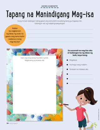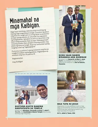 Hulyo 2021 Minamahal na mga KaibiganKasama sa pahinang ito ang isang liham mula sa mga kawani at ang mga isinumite ng mga bata tungkol sa paraan kung paano nila binabasa ang Kaibigan. Henry B. EyringAng Plano ng Kaligayahan ng Ama sa LangitIpinaliwanag ni Pangulong Henry B. Eyring ang mga dahilan ng Ama sa Langit sa paglikha ng plano ng kaligtasan at kung paano makahahanap ng kaligayahan sa pagpili ng tama. Kasama rin dito ang isang pahinang kukulayan. Richard M. RomneyBagong Resipe ni WinfredNalaman ni Winfred na ang paglilingkod sa iba ay tumutulong sa kanya na maging masaya. Masasayang Oras ng Banal na KasulatanAng mga lesson at aktibidad sa home evening batay sa mga lesson ng Pumarito Ka, Sumunod Ka sa Akin para sa bawat linggo ng buwan. Para sa Doktrina at mga Tipan 76–84. Mary YangIsang Ipinagpalibang BiyaheAng ama ni Freddie ay nagpunta sa South Korea dahil may malubhang sakit ang lolo ni Freddie. Gustong sumama ni Freddie sa kanyang ama, ngunit walang sapat na pera ang kanyang pamilya. Kaya sa halip ay araw-araw siyang nanalangin para sa kanyang lolo. Bumisita si Elder Andersen sa ThailandAlamin ang tungkol sa pagbisita ni Elder Andersen sa Thailand. Hanapin Ito!Hanapin ang mga nakatagong bagay sa larawan. Kilalanin si Eta mula sa American SamoaKilalanin ang isang batang babae mula sa American Samoa na tumutulong tulad ni Jesus. Si Jesucristo ay Nagbahagi sa IbaSi Jesus ay nagbahagi ng tinapay at isda sa Kanyang mga disipulo at sinabihan Niya sila na tumulong sa iba. Magtakda ng mithiin na magbahagi sa iba. Charlotte LarcabalIsang Pangarap para kay DieterIsang kuwentong komiks na naglalarawan ng paglalakbay ni Elder Dieter F. Uchtdorf sa pagiging piloto at kung paanong ang mga bata ay maaaring maging anuman ang gusto nilang kahinatnan. Mga Kard ng Kasaysayan ng SimbahanAlamin ang tungkol kina Joseph F. Smith, na pamangkin ni Joseph Smith at kalaunan ay ang propeta, at Ma Naoheakamalu Manuhii, na nag-alaga kay Pangulong Smith habang ito ay isang missionary sa Hawaii. Mga Pioneer Noon at NgayonHanapin ang mga pagkakaiba sa pagitan ng dalawang retratong ito ng mga pioneer. Sheila KindredMga Lihim at Sorpresa“Iniligtas” ng isang batang babae ang papel na manika mula sa isang tindahan at napagtanto niya na ninakaw niya pala ito. Nagpasiya siya na umamin sa kanyang ina sa halip na itago ang lihim na ito. Natutuhan din niya ang pagkakaiba ng lihim at ng sorpresa. Protektahan ang Iyong SariliAng magagawa at sasabihin ng mga bata para panatilihing ligtas ang kanilang sarili mula sa mga tao at mga bagay na maaaring hindi sila komportable. Hinihikayat din ang mga bata na isipin kung sino ang makakausap nila kung may maling nangyayari. Aking Nadarama ang Pag-ibig ni CristoIsang pinasimpleng bersyon ng awitin mula sa Aklat ng mga Awit Pambata. Board Game ng Plano ng KaligtasanIsang larong ginawa upang ituro sa mga bata ang tungkol sa plano ng kaligtasan at maghikayat sa kanilang piliin ang karapatang marating ang kahariang selestiyal. Juan Pablo VillarIniligtas sa Gitna ng mga Bato sa IlogSi Elder Juan Pablo Villar ng Pitumpu ay nagbahagi ng kuwento tungkol sa kung paano siya naipit sa gitna ng ilang bato hanggang sa matagpuan at matulungan siya ng kanyang kuya na makalabas. Pinatotohanan niya na “tutulungan … tayo [ni Jesus] na makalabas sa panganib.” Larong MemoryaPag-aralan ang larawan at tingnan kung ano ang maaalala mo. Ipakita at IkuwentoMga isinumite ng mga bata mula sa iba’t ibang panig ng mundo na nagbabahagi tungkol sa mga personal na karanasan na may mga paksang mula sa pagbibinyag hanggang sa paglilingkod at pamilya. Matt at MandyNagpapatotoo si Mandy tungkol sa Biblia at sa Aklat ni Mormon sa kanyang kaibigang Kristiyano. Batay sa ikawalong Saligan ng Pananampalataya. Para sa mga mas Nakatatandang BataKasama sa pahinang ito ang isang mungkahi para sa paghahandang makapunta sa templo, isang ideya sa family history, at isang isinumite ng isang bata tungkol sa kung gaano siya kasabik na matapos ang itinatayong templo sa hindi kalayuan. Nancy Harward, Lucy Stevenson EwellVaha’i TongaSi Vaha’i ay naging halimbawa sa kanyang mga kaibigan sa boarding school kaya tumigil silang tuksuhin siya dahil sa pananalangin. Nagsimula pa silang magdasal at sumama sa kanya sa simbahan, at ang ilan ay nabinyagan! Tapang na Manindigang Mag-isaIsang pahinang idinisenyo para mapagsulatan at mapagdrowingan ng mga bata ng kanilang mga sariling kuwento. Hinihikayat din nito ang mga bata na isipin kung ano ang kanilang gagawin sa hinaharap. Sarah F.Pumarito Ka, Sumunod ka sa Akin sa Panahon ng COVIDNoong kasagsagan ng pandemya, nalaman ni Sarah na mahalagang gawin ang pagdarasal sa anumang uri ng pag-aaral, at kabilang dito ang bago magsimulang gawin ang takdang aralin. Juliann Tenney DomanAng Tanong ng KatapatanHinirang si Christy para sa isang gawad sa paaralan, pero hindi niya maisip ang mga sagot sa survey. Nagsinungaling siya sa isa sa kanyang mga sagot at nalungkot, kaya bumalik siya sa eskuwela para humingi ng paumanhin. Idrowing ang Isang BayanAng mga missionary na ito ay naglalakad sa bayan at naghahanap ng mga taong maaari nilang turuan. Tulungan sila sa pamamagitan ng pagdrowing ng kanilang bayan at ng ilang tao na maaari nilang kausapin! Para sa Maliliit na Kaibigan Pagtulong sa PalengkeTinulungan ni Marta ang isang matandang lalaki na hanapin ang nawalang aso nito. Maganda ang pakiramdam niya kapag tumutulong siya sa iba. Kasama rin dito ang isang aktibidad kung saan naghahanap ang mga bata ng ibang tao na matutulungan ni Marta. Isang Pangitain ng Plano ng DiyosIsang iginuhit na bersyon na nagpapakita na tinatanggap nina Joseph Smith at Sidney Rigdon ang pangitain tungkol sa plano ng kaligtasan at kung ano ang kahulugan nito sa lahat ng tao sa mundo. May Plano ang Ama sa Langit para sa AkinIsang pahinang kukulayan na partikular na nilayon para sa maliliit na bata at nakasentro sa plano ng kaligayahan ng Ama sa Langit. Lori Fuller SosaAng Paboritong Trabaho ni TomoshiSumasama s