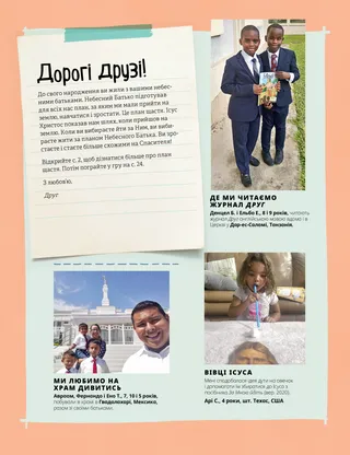 Липень 2021 Дорогі друзі!На цій сторінці міститься лист від редакції і розповіді дітей про те, як вони читають журнал Друг. Генрі Б. АйрінгПлан щастя, підготовлений Небесним БатькомПрезидент Генрі Б. Айрінг пояснює причини того, чому Небесний Батько створив план спасіння і як знайти щастя, вибираючи те, що є правильним. Також додано розмальовку. Річард М. РомніНовий рецепт від ВінфредВінфред дізнається, що служіння іншим допомагає їй бути щасливою. Веселе вивчення ПисаньУроки і заходи для домашнього сімейного вечора, основані на щотижневих завданнях для читання протягом місяця за посібником За Мною йдіть. Учення і Завіти 76–84. Мері ЯнгВідкладена поїздкаТато Фредді їде в Південну Корею, тому що дідусь Фредді сильно захворів. Фредді хочеться поїхати з татом, але у сім’ї не вистачає на це коштів. Натомість він щодня молиться про свого дідуся. Старійшина Андерсен відвідує ТаїландДізнайтеся про візит старійшини Андерсена до Таїланду. Знайди це на малюнку!Знайди на малюнку сховані предмети. Знайомся: Ета з Американського СамоаПознайомся з дівчинкою з Американського Самоа, яка допомагає, як Ісус. Ісус ділився з іншимиІсус поділився хлібом і рибою зі Своїми учнями і сказав їм допомагати іншим. Поставте ціль, щоб з кимось поділитися. Пригоди в Американському Самоа з Марго і ПаолоДізнайся про Американське Самоа і виконай завдання цього місяця від команди “Руки допомоги”. Шарлотта ЛаркабалМрія ДітераІсторія в малюнках, в якій описується шлях старійшини Дітера Ф. Ухтдорфа, який він подолав, щоб стати пілотом літака, а також, як діти можуть стати тими, ким вони бажають. Картки з історії ЦерквиДізнайся про Джозефа Ф. Сміта, який був племінником Джозефа Сміта і зрештою став пророком, а також про Ма Наохеакамалу Манухії, яка піклувалася про Президента Сміта, коли він був місіонером на Гаваях. Піонери тоді і теперЗнайди відмінності між цими двома зображеннями піонерів. Шейла КіндредСекрети і сюрпризиДівчинка “рятує” паперову ляльку з магазину і невдовзі розуміє, що вона її вкрала. Вона вирішує сказати про це мамі, а не тримати в секреті. Також вона дізнається про різницю між секретом і сюрпризом. Захисти себеЩо діти можуть зробити і сказати, аби захистити себе від людей, які можуть змусити їх почуватися незручно, або від чогось іншого. Також заохочуйте дітей подумати про те, з ким вони можуть поговорити, якщо щось не так. Спасителя любовСпрощена версія пісні зі Збірника дитячих пісень. Настільна гра “План спасіння”Гра, створена для того, щоб навчати дітей плану спасіння і заохочувати їх робити правильний вибір, щоб досягти целестіального царства. Хуан Пабло ВілларПорятунок біля гірської річкиСтарійшина Хуан Пабло Віллар, сімдесятник, розповідає історію про те, як він застряг між скелями, доки його не знайшов старший брат і не допоміг звільнитися. Він свідчить, що Ісус “витягне нас з небезпеки”. Гра “Спробуй згадати”Уважно роздивись малюнок і перевір, що тобі вдалося запам’ятати. Покажи й розкажиДописи від дітей з усього світу, в яких розповідається про особистий досвід, що стосується різних тем: хрищення, служіння, сім’ї. Метт і МендіМенді свідчить своїй подрузі, яка є християнкою, про Біблію і Книгу Мормона. На основі восьмого уложення віри. Для дітей старшого вікуНа цій сторінці міститься порада щодо того, як підготуватися ввійти до