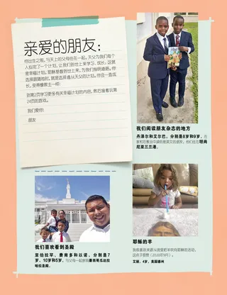 2021年7月 亲爱的朋友本页含杂志职员写的一封信,还有几位儿童的投稿,分享他们阅读朋友杂志的情形。 亨利·艾宁会长天父的幸福计划亨利·艾宁会长说明天父为什么创造了救恩的计划,同时如何从选正义中获得幸福。还包含一张着色页。 理查·罗慕义薇弗雷德的新食谱薇弗雷德学到助人为快乐之本。 经文时间趣味活动家庭晚会课程和活动以来跟从我每月每周的课程为主。配合教义和圣约第76~84篇。 玛丽·杨延期之旅小飞的爷爷病得很重,所以小飞的爸爸要回韩国探病。小飞想跟爸爸一起去,可是他家没有那么多钱,于是他每天为爷爷祈祷。 安德森长老访问泰国了解安德森长老访问泰国的情形。 找找看!把藏在图片里的东西找出来。 认识来自美属萨摩亚的依塔认识一位美属萨摩亚女孩,她像耶稣一样助人。 耶稣与人分享耶稣与门徒分享面包和鱼,告诉他们要去帮助他人。设定目标、与人分享。 跟玛歌和保罗一起探索美属萨摩亚认识美属萨摩亚,参加本月的援助之手挑战。 夏绿蒂·拉卡贝邬希铎的梦想这漫画故事叙述迪特·邬希铎长老成为一名飞行员的心路历程,以及儿童如何能让美梦成真。 教会历史卡了解瑟·斯密的侄子约瑟F.斯密,他最后成了先知,以及斯密会长在夏威夷传教时,照顾他的玛·娜奥荷阿卡玛璐·玛努荷伊。 当年和今日的先驱者找出这两张先驱者图片不同的地方。 席拉·金卓秘密与惊喜一个女孩从店里「救出」一个纸娃娃来,后来才意识到这其实是偷窃行为。她决定告诉妈妈,而不是守着秘密。她也了解到秘密和惊喜之间的差别。 保护自己儿童可以做什么、说些什么,来保护自身的安全,远离令人不自在的人事物。也请他们想想,如果出了什么事,可以跟谁说。 我感受主的爱此乃儿童歌本里的简易版。 救恩计划桌游这游戏教导儿童有关救恩计划,鼓励他们选正义,以达高荣国度。 璜安·维拉长老受困抢救七十员璜安·维拉长老分享了一个故事,讲述他如何被卡在石头中间,直到他的大哥找到他,帮他脱困。祂见证,耶稣必会「救我们脱离险境」。 记忆游戏研究图片,看看能记住什么。 看看我,听听我世界各地的儿童投稿分享个人经验,主题从洗礼、服务到家庭都有。 马太和曼蒂曼蒂有机会和她基督教的朋友分享有关圣经和摩尔门经的见证。根据信条第八条。 大孩子园地这页包含准备进圣殿的小秘诀、做家谱的建议,以及一个小朋友投稿,描述对于自己住家附近要盖圣殿的兴奋心情。 南西·哈沃德和露西·艾维尔瓦哈夷·彤卡瓦哈夷是寄宿生的好榜样,因此他们不再取笑瓦哈夷作祷告,甚至开始跟他一起祈祷、去教会,有些人还受洗了! 独自奋战的勇气此页专门给儿童写下及画下自己的故事,并鼓励他们思考自己将来想做什么。 莎拉,10岁,法国加来海峡省在冠状病毒病期间来跟从我在疫情期间,莎拉了解到在做任何学习前祈祷是很重要的,包括做学校作业前。 茱莉安·杜曼诚实问题克丝蒂在学校收到获奖提名,但她想不出怎么回答问卷。她在其中一个答案撒谎,后来感觉很糟糕,最后回学校道歉。 画出小镇这些传教士在镇里走动,寻找可以教导的人。画出他们的小镇,以及一些他们可以说话的对象,来帮助他们! 幼儿园地 在市场帮忙玛塔帮助一位老人找到他的狗。她在帮助别人时有很好的感觉。内含一项活动,让小孩找一些人,让玛塔帮忙。 一个有关神的计划的异象这插图画的是约瑟·斯密和西德尼·雷格登得到一个有关救恩计划的异象,以及这计划对世上每个人的意义。 天父对我有个计划以天父的幸福计划为中心,专为小小孩设计的着色页。 萝莉·索萨小灯最喜欢的工作小灯每周都跟妈妈去教堂浇花。那是他最喜欢做的事,因为在去教堂的路上可以看见各种美丽的事物。 温蒂·艾里森微小的事即使是小小孩也能做帮助自己学习福音的事。一篇每行都带动作的短诗。 小小孩经文时间趣味活动这些建议是照着来跟从我——供个人和家庭使用的每周进度编排的。特别为小小孩设计的。配合教义和圣约第76~84篇。 亲爱的父母:一封给父母的说明,鼓励他们保护自己的孩子不受虐待。
