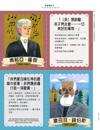教會歷史卡 剪下卡片,沿著虛線對折,然後用膠帶黏起來。 奧莉亞·羅傑 1834-1922 「〔我〕想鼓勵孩子們去愛……一切美好的事物。」 她的家庭在她六歲時加入教會。 她和弟弟妹妹一起橫越平原,而且獨自照顧他們。 在先知的同意下,她舉辦了第一個初級會聚會。 支持給予婦女投票權。 撒母耳·錢伯斯 1831-1929 「我們蒙召喚在神的國度中做事;我們應該履行每一項職責。」 他在13歲時受洗。他想旅行去加入其他聖徒,但是不能,因為他是個奴隸。 21年後,美國終於中止奴隸制度,於是他和家人一起去猶他。 他每週都幫忙打掃教堂。 他經常分享自己的見證,一輩子都很忠信。 布魯克·司馬繪