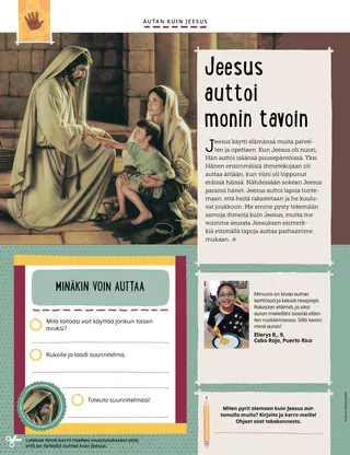 Jeesus käytti elämänsä muita palvellen ja opettaen. Kun Jeesus oli nuori, Hän auttoi isäänsä puusepäntöissä. Yksi Hänen ensimmäisiä ihmetekojaan oli auttaa äitiään, kun viini oli loppunut eräissä häissä. Nähdessään sokean Jeesus paransi hänet. Jeesus auttoi lapsia tuntemaan, että heitä rakastetaan ja he kuuluvat joukkoon. Me emme pysty tekemään samoja ihmeitä kuin Jeesus, mutta me voimme seurata Jeesuksen esimerkkiä etsimällä tapoja auttaa parhaamme mukaan.