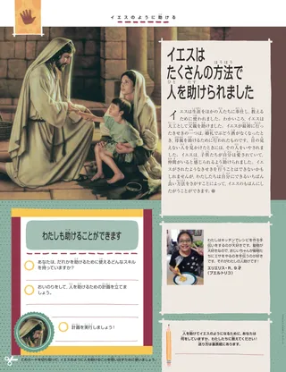 イエスは生涯をほかの人たちに奉仕し,教えるために使われました。わかいころ,イエスは大工として父親を助けました。イエスが最初に行ったきせきの一つは,婚礼でぶどう酒がなくなったとき,母親を助けるために行われたものです。目の見えない人を見かけたときには,その人をいやされました。イエスは,子供たちが自分は愛されていて,仲間がいると感じられるよう助けられました。イエスがされたようなきせきを行うことはできないかもしれませんが,わたしたちは自分にできるいちばん良い方法をさがすことによって,イエスのもはんにしたがうことができます。