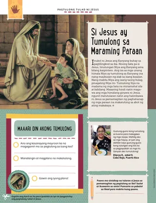 Inukol ni Jesus ang Kanyang buhay sa paglilingkod sa iba. Noong bata pa si Jesus, tinulungan Niya ang Kanyang ama bilang karpintero. Ang isa sa mga unang himala Niya ay tumulong sa Kanyang ina nang maubusan ng alak sa isang kasalan. Nang makita Niya ang isang taong bulag, pinagaling Niya ito. Tumulong Siya na madama ng mga bata na minamahal sila at kabilang. Maaaring hindi natin magawa ang mga himalang ginawa ni Jesus, ngunit matutularan natin ang halimbawa ni Jesus sa pamamagitan ng paghahanap ng mga paraan na makatulong sa abot ng ating makakaya.