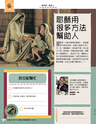 像耶穌一樣助人 耶穌用很多方法幫助人 耶穌一生都在服務和教導人。耶穌還年輕的時候,就幫父親做木匠工作。在一場婚禮中,因為酒不夠,所以祂行了第一個奇蹟,來幫助祂的母親。祂看到一個瞎眼的人,就治好了他,還幫助小孩子感到被愛和被接納。我們可能無法行像耶穌那樣的奇蹟,但是我們可以效法耶穌的榜樣,找出方法盡力幫助別人。● 我很喜歡在廚房裡幫忙,想出自己的食譜。我喜愛動物,所以我很喜歡幫忙外公餵小動物。這就是我幫忙的方式! 愛樂麗斯,9歲,波多黎各 開啟PDF 麥可·馬恩繪
