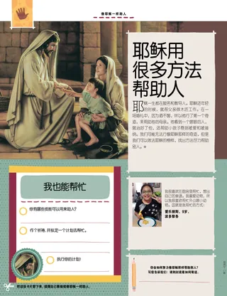 像耶稣一样助人 耶稣用很多方法帮助人 耶稣一生都在服务和教导人。耶稣还年轻的时候,就帮父亲做木匠工作。在一场婚礼中,因为酒不够,所以祂行了第一个奇迹,来帮助祂的母亲。祂看到一个瞎眼的人,就治好了他,还帮助小孩子感到被爱和被接纳。我们可能无法行像耶稣那样的奇迹,但是我们可以效法耶稣的榜样,找出方法尽力帮助别人。● 我很喜欢在厨房里帮忙,想出自己的食谱。我喜爱动物,所以我很喜欢帮忙外公喂小动物。这就是我帮忙的方式! 爱乐丽斯,9岁,波多黎各 开启PDF 麦可·马恩绘