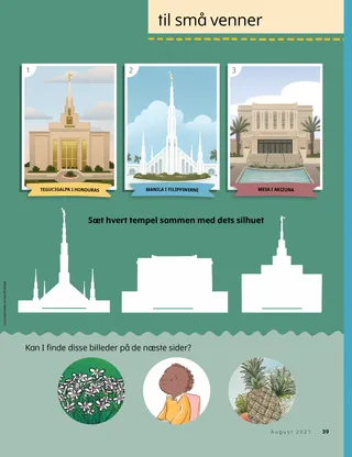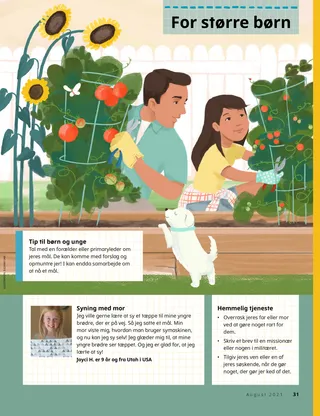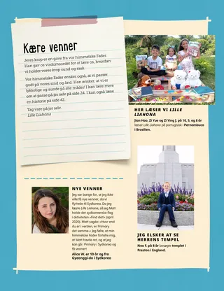 August 2021 Kære vennerLæs et budskab om visdomsordet. Russell M. NelsonKraften i en præstedømmevelsignelsePræsident Nelson fortæller en historie om, hvordan en præstedømmevelsignelse helbredte en syg læge. Happiness Balilemwa, Richard M. RomneyDen vigtige gæstAmmon hjælper sin familie med at byde en vigtig gæst velkommen i deres hjem: Helligånden. Sjov tid med skriftenBrug disse aktiviteter og forslag til at studere Kom og følg mig med jeres familie. Amber HealeyHvem kan vi hjælpe?Tadiana og hendes familie finder måder, hvorpå de kan tjene deres naboer under COVID-19. Ældste Rasband besøger SydafrikaLæs om ældste Rasbands rejse til Sydafrika, hvor han indviede templet i Durban i Sydafrika. Find det!Kan I finde de skjulte dyr fra Sydafrika? Mød Porter fra PolenMød Porter fra Polen og hør om, hvordan han hjælper, ligesom Jesus gjorde. Jesus hjalp på mange måderLæs en historie om, hvordan Jesus hjalp, og lav en plan for at hjælpe, som han gjorde. På eventyr i Polen med Margo og PaoloLær om Polen med Margo og Paolo, og tag imod Hjælpende Hænder-udfordringen. Aleena WadsworthIkke inviteretBecky er ked af det, fordi hun ikke er blevet inviteret med til sin venindes fødselsdagsfest, men hun beslutter sig for at tilgive. Kort med Kirkens historieLær om vigtige personer i Kirkens historie og saml på kortene. DyrespilSpil disse spil for at have det sjovt og få motion! Gayle Kinney-CorneliusBange for tornadoenDa Josiah hører om en tornado, bliver han bange og trist, men han får det bedre, når han tænker på, hvordan han kan hjælpe andre. En lys idéDenne måneds budskab er: »Jeg kan gøre mit hjem til et helligt sted.« Katie C.Trøst gennem Lille LiahonaEn pige er bange for at blive opereret i sin arm. Hun beder og modtager trøst fra vor himmelske Fader gennem en artikel, hun læser i Lille Liahona. Omsorg for mig selv!Læs om, hvordan man følger visdomsordet og passer på sig selv fysisk og følelsesmæssigt, så man kan forblive sund og stærk. Steven R. BangerterFred gennem præstedømmets kraftÆldste Bangerter fortæller en historie om en sygdom, han havde som barn, og hvordan han modtog trøst og styrke gennem præstedømmevelsignelser. Nedtælling til musikFind musik-genstande på billedet. Vis og fortælBørn fra hele verden fortæller om deres talenter og historier. Matt og MandyMatt og Mandy spiller et spil for at lære den niende trosartikel at kende. For større børnTips og udfordringer for større børn. Lucy Stevenson EwellOlga ŠnederflerOlga længes efter at komme i templet, men der er ingen templer i nærheden. Senere bliver hun den første tempelpræsidentinde fra Tjekkoslovakiet. Hvad tænker du påLæs om, hvordan kvinder kan deltage i præstedømmet. Sådan siger man nejLær, hvordan I siger nej, når nogen vil have jer til at bryde visdomsordet. Marissa WiddisonTag en beslutning om stofferAlvin opdager sine venner have stoffer med i skolen. Bør han fortælle det til læreren? Indenfor-udenfor tempelmatchSæt hvert tempel sammen med dets billede fra indeni. Kun digitalt Lucy Stevenson EwellHører stadig fars sangLeah bliver trøstet, efter hendes far har taget sig af dage. For små venner Jenny MaddyTaye besøger templetTaye føler sig godt tilpas, når han besøger templet i Aba i Nigeria med sin familie. VisdomsordetLæs om, hvordan Joseph Smith modtog visdomsordet. Jeg kan passe på min kropFarvelæg en side om at være sund. Jane McBrideAnna deler sit vidnesbyrdAnna lærer om vidnesbyrd i Primary og deler derefter sit vidnesbyrd derhjemme. Hej, venner!Mød nogle små venner fra hele verden. Sjov tid for de små med skriftenBrug disse aktiviteter og forslag til at studere Kom og følg mig med jeres små børn. Kære forældreEt budskab til forældre om, hvordan man kan tale med sine børn om præstedømmet.