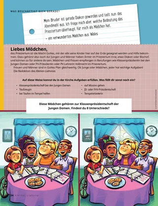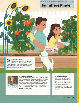 August 2021 Liebe FreundeEin paar Worte zum Wort der Weisheit. Russell M. NelsonDie Macht eines PriestertumssegensPräsident Nelson berichtet, wie ein kranker Arzt durch einen Krankensegen gesund geworden ist. Happiness Balilemwa, Richard M. RomneyEin wichtiger GastAmmon hilft seiner Familie, dass ein wichtiger Gast bei ihnen sein kann: der Heilige Geist. Spaß mit den SchriftenAnregungen und Aktivitäten für das gemeinsame Studium der Anleitung „Komm und folge mir nach!“ mit der Familie. Amber HealeyWem können wir helfen?Tadiana und ihre Familie finden Möglichkeiten, auch während der Pandemie ihrem Nächsten zu helfen. Elder Rasband besucht SüdafrikaEin kurzer Bericht über Elder Rasbands Besuch in Südafrika, wo er auch den Durban-Tempel weihte. SuchbildFindest du die versteckten Tiere aus Südafrika? Porter aus PolenPorter aus Polen hilft so, wie Jesus es getan hat. Jesus hat auf vielerlei Weise geholfenEin paar Beispiele, wie Jesus geholfen hat, und eine Aufforderung, selbst zu helfen. Abenteuer in Polen mit Margo und PaoloErfahre mit Margo und Paolo mehr über Polen und nimmt den Auftrag für diesen Monat an. Aleena WadsworthNicht eingeladenBecky ist traurig, weil eine Freundin sie nicht zum Geburtstag einlädt, aber sie vergibt ihr. Karten zur Geschichte der KircheInfos zu wichtigen Persönlichkeiten aus der Geschichte der Kirche sowie Sammelkarten. Tierisch gute SpieleBei diesen Spielen hat man Spaß und betätigt sich körperlich. Gayle Kinney-CorneliusAngst vorm TornadoJosiah hat Angst, als er von einem Tornado hört, fühlt sich aber besser, als er überlegt, wie er helfen könnte. Ein guter GedankeDie Botschaft für diesen Monat: „Ich kann mein Zuhause zu einem heiligen Ort machen.“ Katie C.Trost dank des Kleinen LiahonasEin Mädchen muss am Arm operiert werden und hat Angst. Es betet, und als es im „Kleinen Liahona“ einen Artikel liest, spürt es, wie der Vater im Himmel es tröstet. Ich geb auf mich acht!Hier erfährt man, wie man das Wort der Weisheit befolgen und auf körperlicher und seelischer Ebene auf sich achtgeben und somit gesund und stark bleiben kann. Steven R. BangerterFriede durch die Macht des PriestertumsElder Bangerter berichtet, wie er als Kind krank war und durch Priestertumssegen Trost und Kraft empfangen hat. Musikalischer CountdownSuch die versteckten Gegenstände. Erzähl uns wasKinder aus aller Welt berichten von sich und zeigen, was sie können. Lukas und LeneLukas und Lene lernen den neunten Glaubensartikel mithilfe eines Brettspiels. Für ältere KinderTipps und Aufträge für ältere Kinder. Lucy Stevenson EwellOlga ŠnederflerOlga möchte in den Tempel gehen, aber es gibt keinen in der Nähe. Später wird sie zur ersten Tempeloberin aus der ehemaligen Tschechoslowakei berufen. Was beschäftigt dich gerade?Näheres dazu, welche Bedeutung das Priestertum für Frauen hat. Nein sagenSo sagt man Nein, wenn jemand möchte, dass man gegen das Wort der Weisheit verstößt. Marissa WiddisonDrogen und eine EntscheidungIn der Schule erwischt Alvin seine Freunde mit Drogen. Soll er seiner Lehrerin Bescheid geben? Wie schaut der Tempel von innen aus?Welche Innenaufnahme gehört zu welchem Tempel? Nur online Lucy Stevenson EwellPapas LiedLeah findet Trost, nachdem ihr Vater sich das Leben genommen hat. Für unsere Kleinen Jenny MaddyTaye besucht den TempelTaybe freut sich über den Besuch am Aba-Tempel in Nigeria mit seiner Familie. Das Wort der WeisheitDie Begebenheit, wie Joseph Smith das Wort der Weisheit empfing. Ich gebe auf meinen Körper achtAusmalbild zum Thema Gesundheit. Jane McBrideAnna gibt ZeugnisIn der PV lernt Anna, wie man Zeugnis gibt, und gibt dann zuhause Zeugnis. Hallo, Freunde!Beiträge von Kindern aus aller Welt. Spaß mit den Schriften für die ganz KleinenAnregungen und Aktivitäten für das Studium der Anleitung „Komm und folge mir nach!“ mit kleinen Kindern. Liebe Eltern!Ein paar Worte an die Eltern, wie sie mit ihren Kindern über das Priestertum sprechen können.