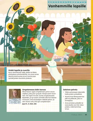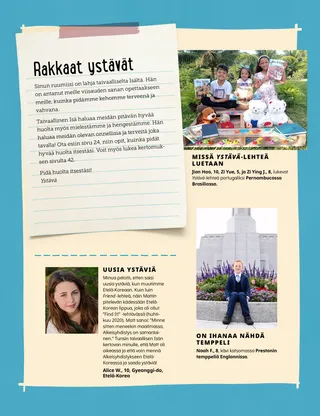 Elokuu 2021 Rakkaat ystävätLue sanoma viisauden sanasta. Russell M. NelsonPappeuden siunauksen voimaPresidentti Nelson kertoo siitä, kuinka pappeuden siunaus paransi sairaan lääkärin. Happiness Balilemwa, Richard M. RomneyTärkeä vierasAmmon auttaa perhettään toivottamaan kotiinsa tervetulleeksi tärkeän vieraan: Pyhän Hengen. Iloa pyhistä kirjoituksistaKäytä näitä tehtäviä ja ideoita, kun tutkitte perheenne kanssa Tule ja seuraa minua -aineistoa. Amber HealeyKeitä me voimme auttaa?Tadiana ja hänen perheensä löytävät tapoja palvella naapureitaan koronan aikana. Vanhin Rasband vieraili Etelä-AfrikassaLue vanhin Rasbandin matkasta Etelä-Afrikkaan, jossa hän vihki käyttöön Durbanin temppelin. Etsi!Löydätkö piilotettuja eläimiä Etelä-Afrikasta? Tutustu Porteriin PuolastaTutustu Porteriin Puolasta ja opi, kuinka hän auttaa Jeesuksen tavoin. Jeesus auttoi monin tavoinLue kertomus siitä, kuinka Jeesus auttoi, ja tee suunnitelma auttaa Hänen laillaan. Seikkailuja Puolassa Margon ja Paolon seurassaTutustu Puolaan Margon ja Paolon seurassa ja osallistu tämän kuukauden Auttavat kädet -haasteeseen. Aleena WadsworthEi kutsuaBecky on surullinen, kun häntä ei ole kutsuttu ystävänsä syntymäpäiville, mutta hän päättää antaa anteeksi. Kirkon historia -kortitLue kirkon historian tärkeistä henkilöistä ja kerää kortteja. EläinleikkejäPitäkää hauskaa ja saakaa liikuntaa leikkimällä näitä leikkejä! Gayle Kinney-CorneliusPelottava pyörremyrskyJosiah on peloissaan ja surullinen, kun hän kuulee pyörremyrskystä, mutta hänestä tuntuu paremmalta, kun hän ajattelee, millä tavoin voi auttaa. Loistava ajatusTämän kuukauden sanoma on: ”Minä voin tehdä kodistamme pyhän paikan.” Katie C.Lohtua Friend-lehdestäTyttöä pelottaa käsivarteen tehtävä leikkaus. Hän rukoilee ja saa taivaalliselta Isältä lohtua artikkelista, jonka hän lukee Friend-lehdestä. Huolehdin itsestäni!Opi, kuinka voit noudattaa viisauden sanaa ja huolehtia itsestäsi fyysisesti ja emotionaalisesti pysyäksesi terveenä ja vahvana. Steven R. BangerterRauhaa pappeuden voimastaVanhin Bangerter kertoo siitä, kuinka hän lapsuusajan sairaudessaan sai lohtua ja voimaa pappeuden siunauksista. Musiikillinen lähtölaskentaEtsi kuvaan piilotetut musiikkiasiat. YstäviltäLapset eri puolilta maailmaa esittelevät kykyjään ja kertovat tarinoitaan. Mikko ja MinttuMikko ja Minttu opettelevat yhdeksättä uskonkappaletta pelaamalla peliä. Vanhemmille lapsilleVinkkejä ja haasteita vanhemmille lapsille. Lucy Stevenson EwellOlga ŠnederflerOlga haluaa mennä temppeliin, mutta lähellä ei ole yhtään temppeliä. Myöhemmin hänestä tulee ensimmäinen Tšekkoslovakiasta kotoisin oleva temppelinemäntä. Mitä on mielessäsi?Opi, kuinka naiset voivat olla osallisia pappeudessa. Opi sanomaan eiOpi sanomaan ei, kun joku haluaa sinun rikkovan viisauden sanaa. Marissa WiddisonPäätös huumeistaAlvin näkee ystävällään koulussa huumeita. Pitäisikö hänen kertoa opettajalle? Yhdistä temppelin sisä- ja ulkopuoliYhdistä jokainen temppeli sen sisäpuolta esittävään kuvaan. Julkaistaan vain sähköisenä Lucy Stevenson EwellKuulen yhä isän laulunLea saa lohtua, kun hänen isänsä kuolee tehtyään itsemurhan. Pikku ystäville Jenny MaddyTaye käy temppelin luonaTayesta tuntuu hyvältä, kun hän käy perheensä kanssa Aban temppelin luona Nigeriassa. Viisauden sanaOpi, kuinka Joseph Smith sai viisauden sanan. Minä voin pitää huolta ruumiistaniVäritä kuva terveenä olemisesta. Jane McBrideAnna lausuu todistuksensaAnna oppii Alkeisyhdistyksessä, mikä on todistus, ja lausuu sitten oman todistuksensa kotona. Hei ystävät!Tutustu muutamiin pikku ystäviimme eri puolilta maailmaa. Iloa pyhistä kirjoituksista pienemmilleKäytä näitä tehtäviä ja ideoita, kun tutkit pienten lastesi kanssa Tule ja seuraa minua -aineistoa. Rakkaat vanhemmatSanoma vanhemmille siitä, kuinka puhua omille lapsille pappeudesta.