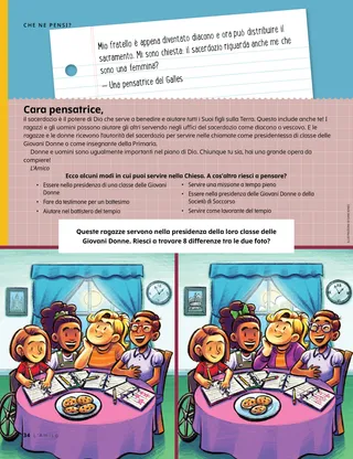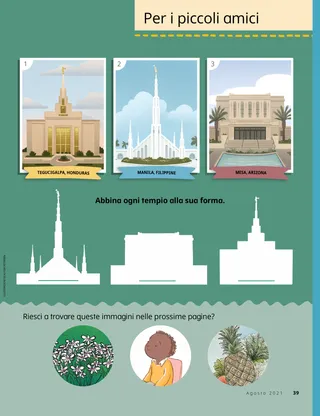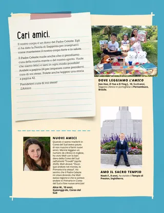 Agosto 2021 Cari amiciLeggi un messaggio sulla Parola di Saggezza. Russell M. NelsonIl potere di una benedizione del sacerdozioIl presidente Nelson condivide la storia di come una benedizione del sacerdozio ha guarito un dottore ammalato. Happiness Balilemwa, Richard M. RomneyL’ospite importanteAmmon aiuta la sua famiglia ad accogliere un ospite importante nella loro casa: lo Spirito Santo. È ora di divertirsi con le ScrittureUsa queste attività e idee per studiare Vieni e seguitami con la tua famiglia. Amber HealeyChi possiamo aiutare?Tadiana e la sua famiglia trovano dei modi per servire i loro vicini durante il COVID-19. L’anziano Rasband visita il SudafricaScopri il viaggio che l’anziano Rasband ha fatto in Sudafrica per dedicare il tempio di Durban. Trova gli animali!Sai trovare gli animali nascosti che vivono in Sudafrica? Incontriamo Porter dalla PoloniaIncontriamo Porter dalla Polonia e scopriamo in che modo aiuta gli altri come faceva Gesù. Gesù aiutava in molti modiLeggi una storia di come Gesù aiutava gli altri e fai un piano per aiutare come faceva Lui. Avventure in Polonia con Margo e PaoloScopri la Polonia con Margo e Paolo e accetta la sfida Helping Hands. Aleena WadsworthNon invitataBecky si sente triste quando non viene invitata alla festa di compleanno della sua amica, ma decide di perdonare. Schede sulla storia della ChiesaConosci le persone importanti della storia della Chiesa e colleziona le schede. Il gioco degli animaliFai questi giochi per divertirti e fare esercizio! Gayle Kinney-CorneliusPaura del tornadoJosiah è impaurito e triste quando sente parlare di un tornado, ma si sente meglio quando pensa a come può aiutare. Un’idea brillanteIl messaggio di questo mese è “Posso rendere la mia casa un luogo santo”. Katie C.Conforto da L’AmicoUna bambina ha paura di un intervento chirurgico al braccio. Prega e riceve conforto dal Padre Celeste grazie a un articolo che legge su L’Amico. Mi prendo cura di me!Impara come seguire la Parola di Saggezza e come prenderti cura di te stesso fisicamente ed emotivamente per essere sano e forte. Steven R. BangerterPace mediante il potere del sacerdozioL’anziano Bangerter racconta la storia della malattia di cui ha sofferto quando era bambino e come ha ricevuto conforto e forza mediante le benedizioni del sacerdozio. Conto alla rovescia musicaleTrova gli oggetti che hanno a che fare con la musica nell’immagine. Mostra e raccontaI bambini di tutto il mondo condividono i loro talenti e le loro storie. Matt e MandyMatt e Mandy fanno un gioco per imparare il nono articolo di fede. Per i bambini più grandiSuggerimenti e sfide per i bambini più grandi. Lucy Stevenson EwellOlga ŠnederflerOlga desidera andare al tempio, ma non ci sono templi vicino a lei. In seguito diventerà la prima matrona del tempio proveniente dalla Cecoslovacchia. Che ne pensi?Impara come le donne possono avere un ruolo nel sacerdozio. Come dire di noCome dire di no quando qualcuno vuole che tu infranga la Parola di Saggezza. Marissa WiddisonLa decisioneAlvin vede i suoi amici con la droga a scuola. Dovrebbe dirlo all’insegnante? Abbina l’interno all’esterno del tempioAbbina ogni tempio con la rispettiva foto dell’interno. Solo digitale Lucy Stevenson EwellSentire ancora la canzone di papàLeah riceve conforto dopo la morte di suo padre per suicidio. Per i piccoli amici Jenny MaddyTaye visita il tempioTaye si sente bene quando visita il tempio di Aba, in Nigeria, con la sua famiglia. La Parola di SaggezzaScopri come Joseph Smith ricevette la Parola di Saggezza. Posso prendermi cura del mio corpoColora una pagina che insegna a essere in salute. Jane McBrideAnna condivide la sua testimonianzaAnna impara cos’è una testimonianza in Primaria e poi condivide la sua testimonianza a casa. Ciao, amici!Incontriamo alcuni piccoli amici da tutto il mondo. È ora di divertirsi con le Scritture per i più piccoliUsa queste attività e idee per studiare Vieni e seguitami con i più piccoli. Cari genitori,Un messaggio per i genitori su come parlare del sacerdozio ai loro figli.