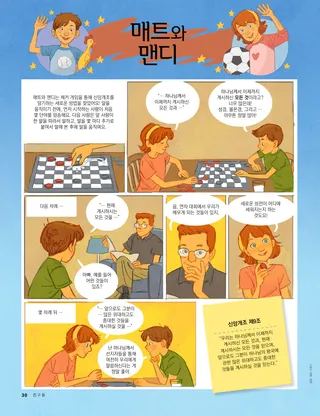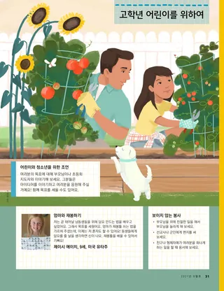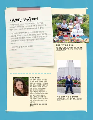 2021년 8월호 사랑하는 친구들에게지혜의 말씀에 관한 메시지를 읽어 보세요. 러셀 엠 넬슨 회장신권 축복의 힘넬슨 회장님이 신권 축복을 통해 아픈 의사를 낫게 하셨던 경험을 들려줄 거예요. 해피니스 발릴림바 및 리처드 엠 롬니중요한 손님암몬은 가족들이 중요한 손님을 맞이하도록 도왔어요. 그 손님은 바로 성신이었어요! 즐거운 경전 속으로가족과 함께 와서 나를 따르라를 공부할 때 아래 활동과 아이디어들을 활용해 보세요. 앰버 힐리우리가 누구를 도울 수 있을까?타디아나가 가족과 함께 코로나19 상황 속에서 이웃들에게 봉사할 방법을 찾아요. 남아프리카 공화국을 방문한 래스번드 장로님래스번드 장로님이 남아프리카를 방문해서 남아프리카공화국 더반 성전을 헌납하신 이야기를 알아보세요. 숨은 그림 찾기남아프리카 공화국에 사는 동물들이 어디에 숨어 있는지 찾을 수 있나요? 폴란드에 사는 포터를 만나 보세요폴란드에 사는 포터가 어떻게 예수님처럼 사람들을 돕는지 알아보세요. 예수님은 여러 가지 방법으로 사람들을 도우셨어요예수님께서 사람들을 도우신 이야기를 읽고, 그분처럼 다른 사람을 돕기 위한 계획을 세워 보세요. 마고, 파올로와 함께 떠나는 폴란드 탐험마고, 파올로와 함께 폴란드에 대해 알아보고, 이번 달 도움의 손길 과제를 받아 보세요. 얼리나 워즈워스초대받지 못했어요베키는 친구의 생일파티에 초대받지 못해서 슬펐어요. 하지만 베키는 친구를 용서하기로 마음먹었어요. 교회 역사 카드교회 역사에서 중요한 인물들에 관해 배우고 카드를 모아 보세요. 동물 흉내내기여기에 소개된 재미있는 놀이를 하면서 몸을 움직여 보세요! 게일 키니 코닐리어스토네이도가 무서워요조사이아는 토네이도 소식에 두렵고 마음이 슬펐어요. 하지만 자신에게 도움이 될 방법들을 생각해 내면서 마음이 한결 편안해졌어요. 빛나는 아이디어이번 달 메시지는 “나는 우리 가정을 거룩한 곳으로 만들 수 있어요”입니다. 케이티 씨, 11세, 미국 유타주『친구들』에서 얻은 위로한 소녀가 팔에 수술을 받는 것을 무서워했어요. 그 소녀는 기도하고 『친구들』 잡지에서 읽은 글을 통해 하나님 아버지로부터 위로를 받았어요. 나를 잘 돌볼 거예요!지혜의 말씀을 따르는 방법을 배우고, 건강하고 강하게 지내기 위해 신체적, 정신적으로 자신을 돌보는 방법을 배워 보세요. 스티븐 알 뱅거터 장로신권 권능에서 얻는 평안뱅거터 장로님은 어린 시절 앓았던 병과 그가 신권 축복을 통해 어떻게 위로와 힘을 얻었는지 이야기합니다. 쿵짝짝 쿵짝짝그림에서 음악과 관련된 물건을 찾아보세요. 우리의 이야기를 들려줄게요전 세계 어린이들이 자신의 재능과 이야기를 나눕니다. 매트와 맨디매트와 맨디는 신앙개조 제9조를 외우기 위해 게임을 해요. 고학년 어린이를 위하여고학년 어린이를 위한 조언과 도전 과제 루시 스티븐슨 이웰올가 슈네데르페르올가는 성전에 가고 싶어 했지만 근처에 성전이 없었어요. 나중에 올가는 체코슬로바키아 사람 중에 최초로 성전 메이트론이 됐어요. 무슨 생각을 하고 있나요?여성이 신권에 참여할 수 있는 방법에 대해 알아보세요. 싫다고 말하는 방법누군가가 여러분이 지혜의 말씀을 어기기를 원할 때 거절하는 방법을 배워 보세요. 머리사 위디슨내가 어떻게 해야 할까?앨빈은 학교에서 마약을 하고 있는 친구들을 봅니다. 이 일을 선생님에게 말씀드려야 할까요? 성전의 안과 겉모습을 맞춰 보세요각 성전의 겉모습과 안쪽 사진을 맞춰 보세요. 온라인 전용 루시 스티븐슨 이웰여전히 아빠 노래를 듣고 있어요레아는 아빠가 자살로 돌아가신 후 위안을 받았어요. 어린 친구들을 위하여 제니퍼 매디성전에 간 타예타예는 가족과 함께 나이지리아 아바 성전에 갈 때 기분이 좋아요. 지혜의 말씀조셉 스미스가 지혜의 말씀을 계시로 받은 과정에 대해 알아보세요. 나는 내 몸을 잘 돌볼 수 있어요건강을 주제로 하는 색칠 놀이를 해 보세요. 제인 맥브라이드간증을 나눈 애나애나가 초등회에서 간증에 대해 배우고 집에서 간증을 전해요. 친구야, 안녕?전 세계의 어린 친구들을 만나보세요. 어린아이들을 위한 즐거운 경전 속으로이 활동과 아이디어를 사용하여 자녀와 함께 『와서 나를 따르라』를 공부해 보세요. 사랑하는 부모 여러분부모를 위한 메시지: 자녀에게 신권에 대해 이야기하는 방법