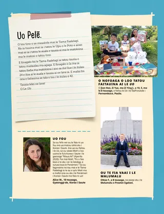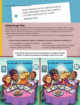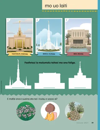 Aokuso 2021 Uo PelēFaitau se savali e uiga i le Upu o le Poto. Russell M. NelsonO Le Mana o se Faamanuiaga FaaleperisituaUa faasoa mai e Peresitene Nelson se tala e uiga i le auala na faamalolo ai e se faamanuiaga faaleperisitua se fomai sa ma’i. Happiness Balilemwa, Richard M. RomneyO le Malo TauaUa fesoasoani Amona i lona aiga ia talia se malo taua i lo latou aiga: o le Agaga Paia. Taimi Fiafia i Tusitusiga PaiaFaaaoga nei gaoioiga ma manatu e suesue ai le Sau, Mulimuli Mai ia te A’u ma lou aiga. Amber HealeyO Ai E Mafai Ona Tatou Fesoasoani Atu i Ai?Na sailia e Tadiana ma lona aiga ni auala e auauna atu ai i o latou tuaoi i le taimi o le KOVITI-19. Ua asiasi atu Elder Rasband i Aferika i SauteAoao e uiga i le malaga a Elder Rasband i Aferika i Saute, lea na ia faapaiaina ai le malumalu o Durban Aferika i Saute. Su’e Mai!E mafai ona e sueina manu o loo natia mai Aferika i Saute? Feiloai ma Porter mai PolaniFeiloai ma Porter mai Polani ma aoao i le ala na te fesoasoani ai e pei ona sa faia e Iesu. Na Fesoasoani Iesu i le Tele o AualaFaitau se tala e uiga i le ala na fesoasoani ai Iesu ma faia se fuafuaga e fesoasoani ai e pei ona sa Ia faia. Malaga Asiasi i Polani faatasi ma Margo ma PaoloAoao e uiga ia Polani faatasi ma Margo ma Paolo ma fai le lu’i o Lima Fesoasoani. Aleena WadsworthE lei ValaauliainaE lagona e Becky le faanoanoa pe a le valaaulia o ia i le pati o le aso fanau o lana uo, ae ua ia filifili e faamagalo atu. Kata o le Talafaasolopito o le EkalesiaAoao e uiga i tagata taua mai le talafaasolopito o le Ekalesia ma ao mai ia kata. Taaloga ManuTaaalo i nei taaloga ia maua ai le fiafia ma maua ai se faamalositino! Gayle Kinney-Cornelius Asiosio TaufaafefeE fefe ma faanoanoa Iosia pe a faalogo o ia e uiga i se asiosio, ae e sili atu lona lagona lelei pe a ia mafaufau i ni auala e fesoasoani atu ai. Manatu LeleiO le savali o le masina lenei, “E mafai ona ou faia lo’u aiga o se nofoaga paia.” Katie C.Faamafanafanaga mai le UoO se teineititi e fefe e fai se taotoga i lona lima. Sa tatalo o ia ma maua le faamafanafanaga mai le Tama Faalelagi e ala i se tusiga na ia faitauina i le Uo. Tausia o A’u Lava!Aoao pe faapefea ona mulimuli i le Upu o le Poto ma tausi oe lava i le faaletino ma faalelagona ina ia tumau ai i le soifua maloloina ma le malosi. Steven R. BangerterFilemu e ala i le Mana o le PerisituaUa faamatala e Elder Bangerter se tala e uiga i lona gasegase a o tamaitiiti ma le auala na ia maua ai le mafanafana ma le malosi e ala i faamanuiaga faaleperisitua. Faitauga MusikaSu’e mea fai musika o loo natia i le ata. Faaali ma Ta’u AtuUa faasoa atu e tamaiti mai le salafa o le lalolagi a latou taleni ma tala. Matt ma MandyO Matt ma Mandy e taaalo i se taaloga e aoao ai le mataupu faavae o le faatuatua lona iva. Mo Tamaiti MatutuaO Motugaafa ma Luitau mo tamaiti e matutua atu. Lucy Stevenson EwellOlga ŠnederflerE moomoo lava Olga e alu i le malumalu, ae e le o i ai ni malumalu e lata ane. Mulimuli ane, ua avea o ia ma uluai faatina o le malumalu mai Siekisolovakia. O le A Se Mea o i Lou MafaufauAoao e uiga i le auala e mafai ai e tamaitai ona auai i le perisitua. Le Auala e Fai Atu ai LeaiAoao i le auala e fai atu ai leai, pe a manao se tasi e te solia le Upu o le Poto. Marissa WiddisonO Le Filifiliga o Fualaau FaasainaUa vaai Alevini i ana uo ma fualaau faasaina i le aoga. E tatau ona ia ta’u atu i le faiaoga? Faafetaui Totonu-Fafo o le MalumaluFaafetaui ia malumalu taitasi ma lona ata mai totonu. Ua Na’o Tusiga Faatekinolosi Saunia e Lucy Stevenson Ewell“O Loo Faalogoina Pea le Pese a Tamā”Ua maua e Leah le faamafanafanaga ina ua maliu lona tamā i le pule i le ola. Mo Uo Laiti Jenny MaddyUa Asiasi atu Taye i le MalumaluE maua e Taye le lagona lelei i totonu pe a asiasi atu ma lona aiga i le Malumalu o Aba Nigeria. O Le Upu o le PotoAoao e uiga i le auala na maua ai e Iosefa Samita le Upu o le Poto. E Mafai Ona Ou Tausia Lo’u TinoValivali se itulau e uiga i le maloloina. Jane McBrideUa Faasoa atu e Ana Lana MolimauUa aoao Ana e uiga i molimau i le Peraimeri ona ia faasoa atu lea o lana molimau i le aiga. Talofa, Uo!Feiloai atu i nisi o uo laiti mai le salafa o le lalolagi. Taimi Fiafia i Tusitusiga Paia mo Fanau LaitiFaaaoga nei gaoioiga ma manatu e suesue ai le Sau, Mulimuli mai ia te A’u ma a outou fanau laiti. Matua PelēO se savali mo matua e uiga i le auala e talanoa atu ai ia latou fanau e uiga i le perisitua.