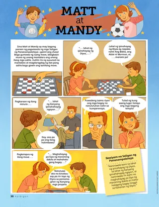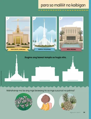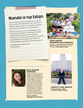 Agosto 2021 Minamahal na mga KaibiganMagbasa ng isang mensahe tungkol sa Word of Wisdom. Russell M. NelsonAng Kapangyarihan ng Basbas ng PriesthoodNagkuwento si Pangulong Nelson tungkol sa kung paano pinagaling ng basbas ng priesthood ang isang doktor na maysakit. Happiness Balilemwa, Richard M. RomneyAng Mahalagang PanauhinTinulungan ni Ammon ang kanyang pamilya na masayang tanggapin ang isang mahalagang panauhin sa kanilang tahanan: ang Espiritu Santo. Masayang Oras sa Pag-aaral ng mga Banal na KasulatanGamitin ang mga aktibidad at ideyang ito sa pag-aaral ng Pumarito Ka, Sumunod Ka sa Akin kasama ang iyong pamilya. Amber HealeyPaano Tayo Makatutulong?Si Tadiana at ang kanyang pamilya ay nakahanap ng mga paraan na mapaglingkuran ang kanilang mga kapitbahay sa panahon ng COVID-19. Bumisita si Elder Rasband sa South AfricaAlamin ang tungkol sa paglalakbay ni Elder Rasband sa South Africa, kung saan inilaan niya ang Durban South Africa Temple. Hanapin Ito!Kaya mo bang mahanap ang nakatagong mga hayop mula sa South Africa? Kilalanin si Porter mula sa PolandKilalanin si Porter mula sa Poland at alamin kung paano siya tumutulong na tulad ni Jesus. Si Jesus ay Tumulong sa Maraming ParaanBasahin ang kuwento tungkol sa pagtulong ni Jesus at magplanong tumulong na tulad ng ginawa Niya. Mga Pambihirang Karanasan sa Poland Kasama sina Margo at PaoloAlamin ang tungkol sa Poland kasama sina Margo at Paolo at gawin ang hamon ng Mga Matulunging Kamay. Aleena WadsworthHindi InimbitahanNalungkot si Becky nang hindi siya inimbitahan sa birthday party ng kaibigan niya, pero nagpasiya siyang magpatawad. Mga Kard ng Kasaysayan ng SimbahanAlamin ang tungkol sa mahahalagang tao mula sa kasaysayan ng Simbahan at tipunin ang mga kard. Mga Animal GameLaruin ang mga larong ito para makapaglibang at makapag-ehersisyo! Gayle Kinney-CorneliusTakot sa BuhawiNatakot at nalungkot si Josiah nang mabalitaan ang tungkol sa buhawi, pero sumasaya ang pakiramdam niya kapag nag-iisip siya ng mga paraan para makatulong. Magandang IdeyaAng mensahe sa buwang ito ay, “Kaya kong gawing banal na lugar ang aking tahanan.” Katie C.Kapanatagan mula sa KaibiganNatakot ang isang batang babae na magpaopera ng kanyang braso. Nagdasal siya at nakatanggap ng kapanatagan mula sa Ama sa Langit sa pamamagitan ng isang artikulong nabasa niya sa Kaibigan. Pangangalaga sa Aking Sarili!Alamin kung paano masusunod ang Word of Wisdom at maalagaan ang iyong katawan at isipan para manatiling malusog at malakas. Steven R. BangerterKapayapaan sa Pamamagitan ng Kapangyarihan ng PriesthoodIkinuwento ni Elder Bangerter ang tungkol sa kanyang karamdaman noong siya ay bata pa at kung paano siya nakatanggap ng kapanatagan at lakas sa pamamagitan ng mga basbas ng priesthood. Music CountdownHanapin ang mga aytem na pangmusika sa larawan. Ipakita at IkuwentoIbinabahagi ng mga bata mula sa iba’t ibang panig ng mundo ang kanilang mga talento at kuwento. Matt at MandySina Matt at Mandy ay naglaro ng isang laro para matutuhan ang ikasiyam na saligan ng pananampalataya. Para sa mga Mas Nakatatandang BataMga mungkahi at hamon para sa mga mas nakatatandang bata. Lucy Stevenson EwellOlga ŠnederflerSi Olga ay umaasam na makapasok sa templo, ngunit walang templong malapit sa kanila. Kalaunan siya ang naging unang matron sa templo mula sa Czechoslovakia. Ano ang Iniisip MoAlamin kung paano maaaring makibahagi ang kababaihan sa priesthood. Paano Magsabi ng HindiMatutong magsabi ng hindi kapag may isang tao na gustong suwayin mo ang Word of Wisdom. Marissa WiddisonAng Desisyon tungkol sa DrogaNakita ni Alvin ang kanyang mga kaibigan na may dalang droga sa paaralan. Dapat ba niya itong sabihin sa guro? Masasayang Bagay: Pagtutugma sa Loob at Labas ng TemploItugma ang bawat templo sa larawan ng loob nito. Digital Lamang Ni Lucy Stevenson EwellPinakikinggan pa rin ang Awit ni ItayNapanatag si Leah matapos magpakamatay ang kanyang ama. Para sa Maliliit na Kaibigan Jenny MaddyBumisita si Taye sa TemploMaganda ang pakiramdam ni Taye kapag bumibisita sa Aba Nigeria Temple kasama ang kanyang pamilya. Ang Word of WisdomAlamin kung paano natanggap ni Joseph Smith ang Word of Wisdom. Kaya Kong Alagaan ang Aking KatawanKulayan ang isang pahina tungkol sa pagiging malusog. Jane McBrideIbinahagi ni Anna ang Kanyang PatotooNalaman ni Anna sa Primary ang tungkol sa patotoo at pagkatapos ay ibinahagi ang kanyang patotoo sa tahanan. Hello, mga Kaibigan!Kilalanin ang ilang munting mga kaibigan mula sa iba’t ibang panig ng mundo. Masayang Oras sa Pag-aaral ng mga Banal na Kasulatan para sa Maliliit na BataGamitin ang mga aktibidad at ideyang ito sa pag-aaral ng Pumarito Ka, Sumunod Ka sa Akin kasama ang inyong mga musmos. Minamahal Naming mga MagulangIsang mensahe para sa mga magulang tungkol sa paano kausapin ang kanilang mga anak tungkol sa priesthood.