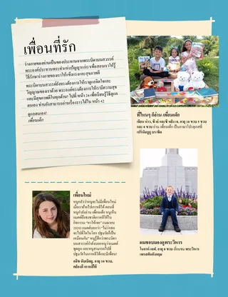 สิงหาคม 2021 เพื่อนที่รักอ่านข้อความเกี่ยวกับพระคำแห่งปัญญา รัสเซลล์ เอ็ม. เนลสันอำนาจของพรฐานะปุโรหิตประธานเนลสันเล่าว่าพรฐานะปุโรหิตรักษาแพทย์ที่เจ็บป่วยอย่างไร แฮปปี้เนสส์ บาลิเลมวา, ริชาร์ด เอ็ม. รอมนีย์แขกคนสำคัญแอมมอนช่วยให้ครอบครัวของเขาต้อนรับแขกคนสำคัญในบ้านของพวกเขา ซึ่งก็คือพระวิญญาณบริสุทธิ์ สนุกกับช่วงเวลาพระคัมภีร์ใช้กิจกรรมและแนวคิดเหล่านี้ในการศึกษา จงตามเรามา กับครอบครัวของท่าน แอมเบอร์ เฮลีย์เราจะช่วยใครได้บ้าง?ทาเดียนาและครอบครัวของเธอพบหนทางที่จะช่วยเหลือเพื่อนบ้านของพวกเขาในช่วงโรคระบาดโควิด 19 เอ็ลเดอร์ราสแบนด์เยือนแอฟริกาใต้เรียนรู้เกี่ยวกับการเดินทางของเอ็ลเดอร์ราสแบนด์ไปยังแอฟริกาใต้เพื่ออุทิศพระวิหารเดอร์บัน แอฟริกาใต้ หาให้เจอ!ท่านหาสัตว์จากแอฟริกาใต้ที่ซ่อนอยู่ได้ไหม? พบกับพอร์เตอร์จากโปแลนด์พบกับพอร์เตอร์จากโปแลนด์และเรียนรู้ว่าเขาช่วยเหมือนพระเยซูทรงช่วยอย่างไร พระเยซูทรงช่วยเหลือหลายทางอ่านเรื่องราวเกี่ยวกับวิธีที่พระเยซูทรงช่วยเหลือและวางแผนในการช่วยเหลือเหมือนพระองค์ทรงทำ การผจญภัยในโปแลนด์กับมาร์โกและเปาโลเรียนรู้เกี่ยวกับโปแลนด์กับบมาร์โกและเปาโล และรับเรื่องท้าทายในการร่วมมือร่วมใจ แอลิน่า แวดสเวิร์ธไม่ได้รับเชิญเบ็กกี้รู้สึกเศร้าเมื่อเธอไม่ได้รับเชิญให้ร่วมงานเลี้ยงวันเกิดของเพื่อน แต่เธอตัดสินใจยกโทษให้ การ์ดประวัติศาสนจักรเรียนรู้เกี่ยวกับบุคคลสำคัญจากประวัติศาสนจักรและสะสมการ์ด เกมสัตว์เล่นเกมเหล่านี้เพื่อความสนุกและออกกำลังกาย! กายล์ คินนีย์-คอร์เนเลียสความกลัวทอร์นาโดโจไซอาห์กลัวและเสียใจเมื่อเขาได้ยินเกี่ยวกับทอร์นาโด แต่เขารู้สึกดีขึ้นเมื่อเขาคิดหาวิธีช่วยเหลือ คมวาทะข่าวสารของเดือนนี้คือ “ฉันสามารถทำให้บ้านของฉันเป็นสถานที่ศักดิ์สิทธิ์” เคธี ซี.การปลอบโยนจากเพื่อนเด็กเด็กหญิงคนหนึ่งรู้สึกกลัวที่จะรับการผ่าตัดแขนของเธอ เธอสวดอ้อนวอนและได้รับการปลอบโยนจากพระบิดาบนสวรรค์ผ่านบทความที่เธออ่านในเพื่อนเด็ก การดูแลฉัน!เรียนรู้วิธีทำตามพระคำแห่งปัญญา รวมถึงดูแลร่างกายและอารมณ์ของท่านเพื่อให้มีสุขภาพดีและแข็งแรงอยู่เสมอ สตีเวน อาร์. แบงเกอร์เทอร์สันติสุขผ่านอำนาจฐานะปุโรหิตเอ็ลเดอร์แบงเกอร์เทอร์เล่าเรื่องความเจ็บป่วยในวัยเด็กของท่านและวิธีที่ท่านได้รับการปลอบโยนและความเข้มแข็งผ่านพรฐานะปุโรหิต นับถอยหลังดนตรีค้นหาสิ่งของเกี่ยวกับดนตรีที่อยู่ในรูปภาพ เล่าสู่กันฟังเด็กจากท