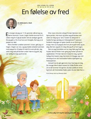 Selv om jeg fremdeles var lei meg, følte jeg fred. Jeg husker denne freden hver gang jeg tenker på denne opplevelsen. Primær-læreren betjente meg, og Den hellige ånd trøstet meg. Det bidro til å bygge opp mitt vitnesbyrd om vår himmelske Faders kjærlighet og frelsesplanen.