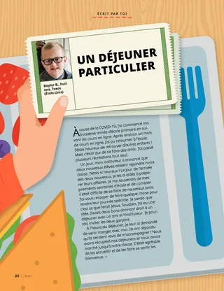 Un jour, mon instituteur a annoncé que deux nouveaux élèves allaient rejoindre notre classe. J’étais si heureux ! Le jour de l’arrivée des deux nouveaux, je les ai aidés à préparer leurs affaires. Je me souvenais de mes premières semaines d’école et de combien il était difficile de se faire de nouveaux amis. J’ai voulu essayer de faire quelque chose pour rendre leur journée spéciale. Je savais que c’est ce que ferait Jésus. Soudain, j’ai eu une idée. J’avais deux bons donnant droit à un déjeuner avec un ami et l’instituteur. Je pourrais inviter les deux garçons.